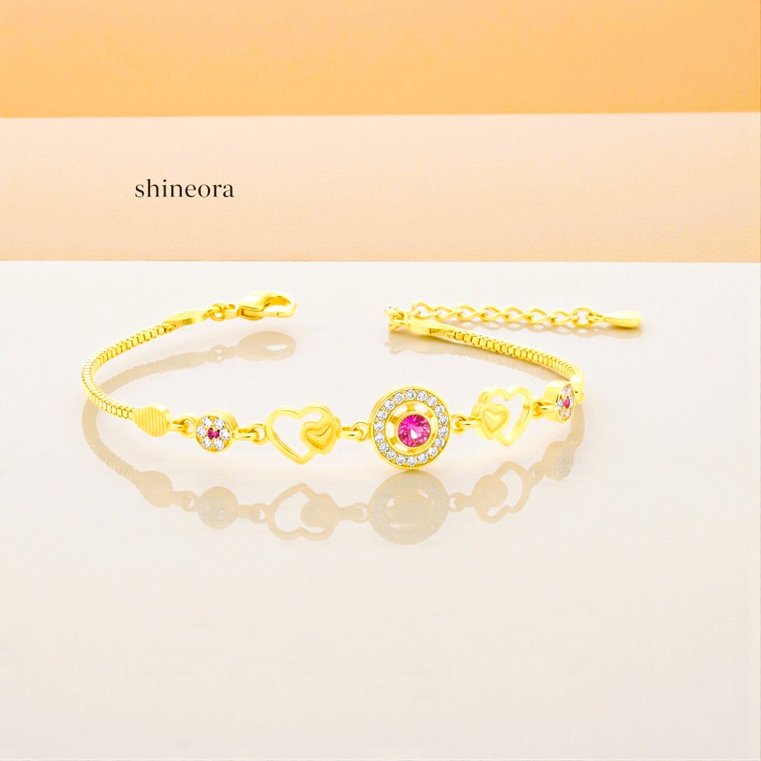Radiate love and light with the Shineora Aura Heart Bracelet, a perfect blend of elegance and emotion. Crafted in one-gram gold plating, this exquisite piece features delicately linked open-heart motifs and sparkling crystal accents, highlighted by a radiant pink centerpiece. Its adjustable design ensures a comfortable fit, making it ideal for daily wear or gifting. Elegant, playful, and full of charm — this bracelet celebrates the joy of love with Shineora’s signature golden glow.