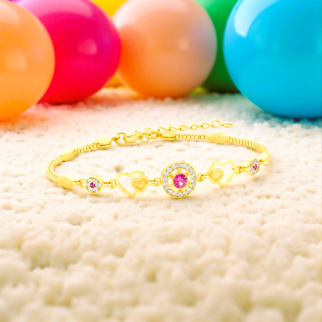 The Shineora Pink Bloom Heart Bracelet is a celebration of joy, love, and sparkle. Crafted in radiant one-gram gold plating, this dainty bracelet features open-heart motifs beautifully linked with a stunning pink stone centerpiece surrounded by glimmering crystals. Its playful yet elegant design makes it perfect for gifting, festive occasions, or adding a pop of charm to your everyday style. Lightweight, skin-friendly, and full of life — it’s Shineora’s way of turning affection into art.