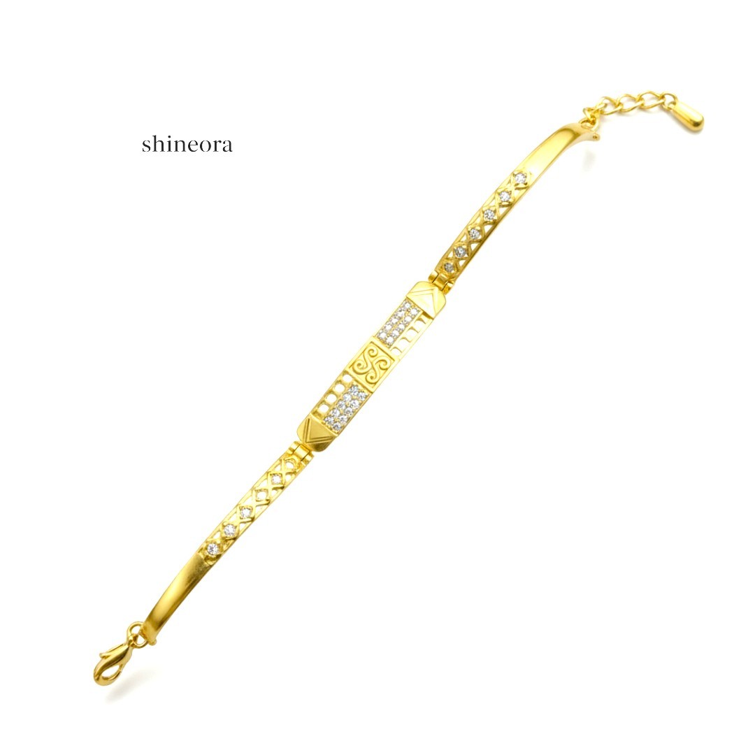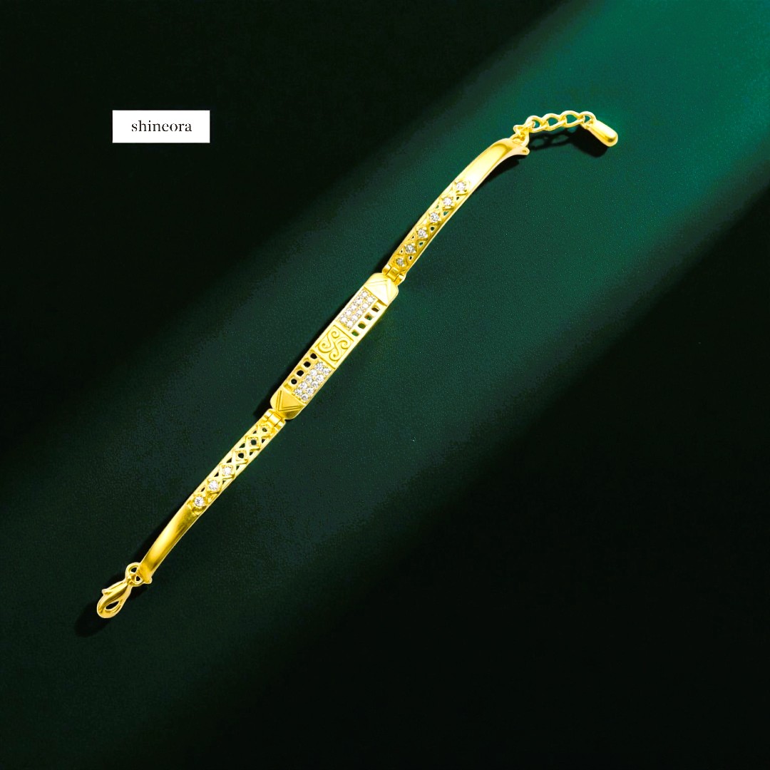 Redefine sophistication with the Shineora Aryan Royale Bracelet, a perfect fusion of class and craftsmanship. Designed in one-gram gold plating, this bracelet showcases a striking combination of geometric artistry, textured detailing, and shimmering stone accents. Its sleek yet bold design makes it an ideal choice for modern men and women who appreciate timeless elegance. Lightweight, durable, and skin-friendly — this bracelet adds a royal touch to everyday style, reflecting the signature Shineora blend of tradition and trend.