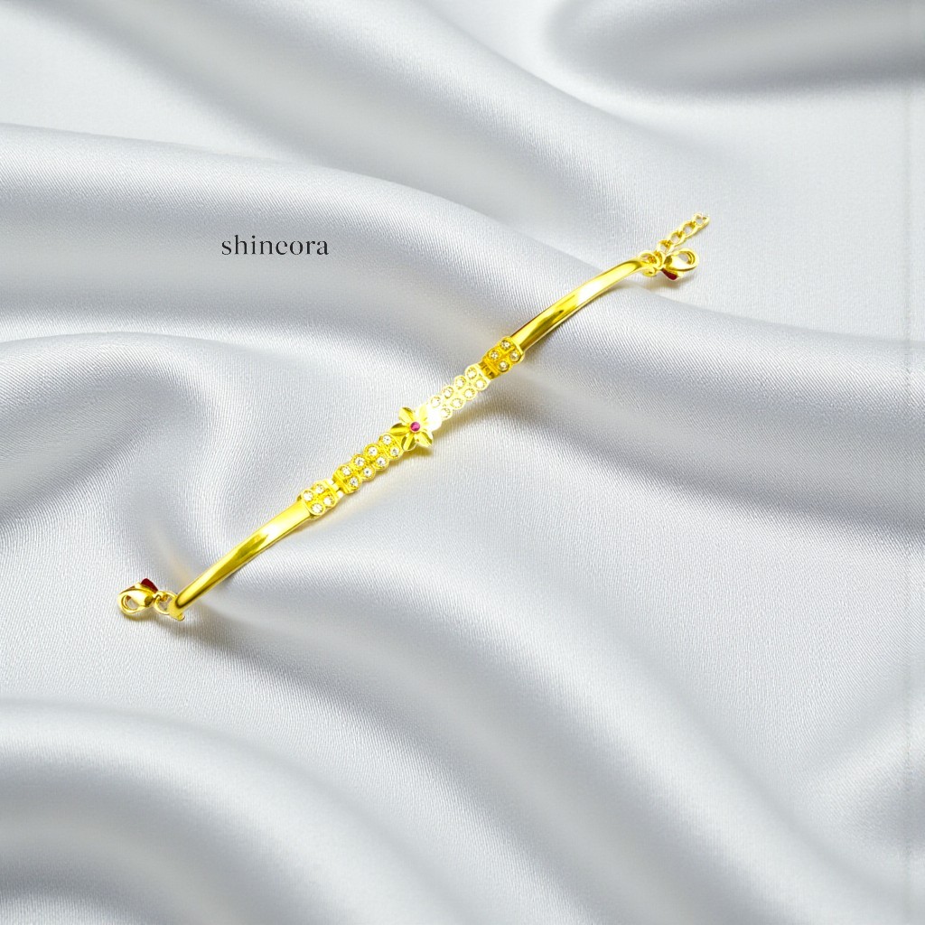 Radiate charm and positivity with the Shineora Surya Blossom Bracelet, a design that captures the brilliance of sunlight in every detail. Crafted in lustrous one-gram gold plating, this elegant bracelet features a floral-inspired centerpiece with a touch of red stone at its heart, symbolizing beauty and energy. Adorned with delicate crystal accents, it adds the perfect sparkle to your everyday elegance. Lightweight, skin-friendly, and timelessly chic, it’s ideal for daily wear or gifting to someone who brightens your life.