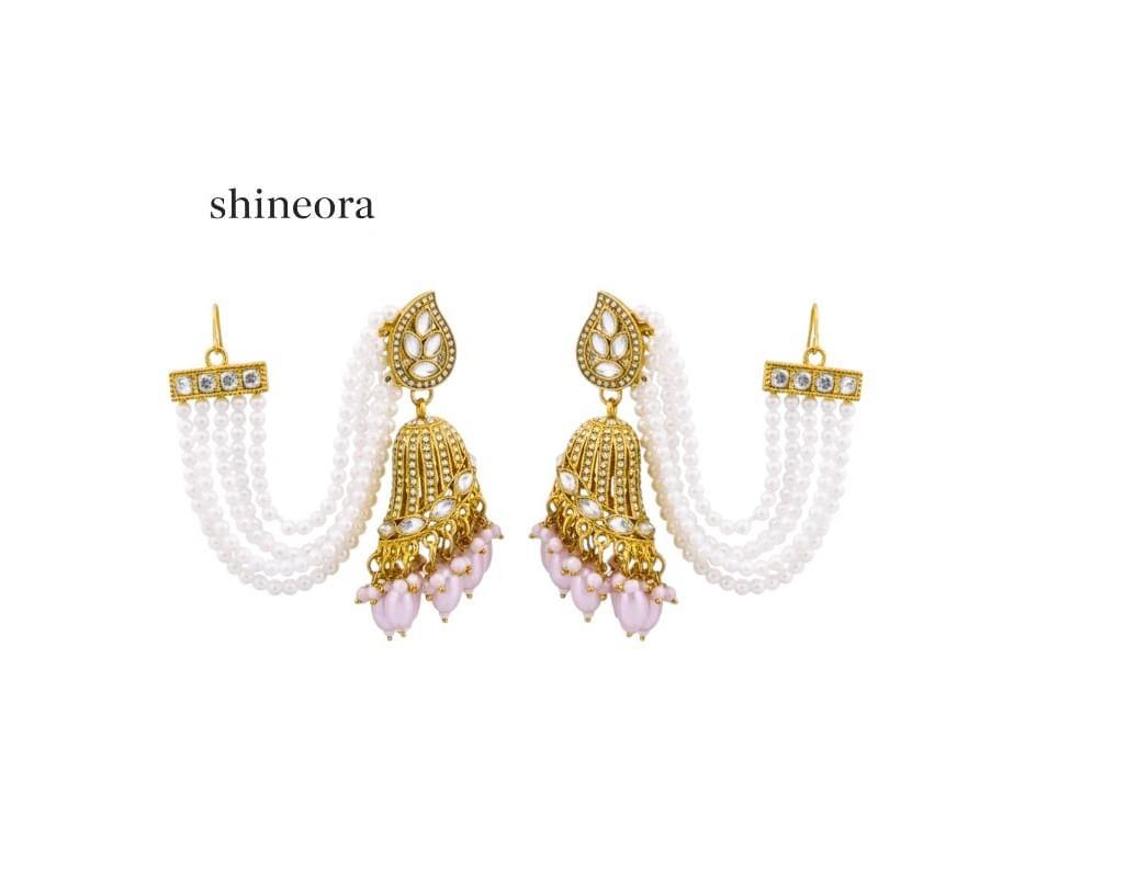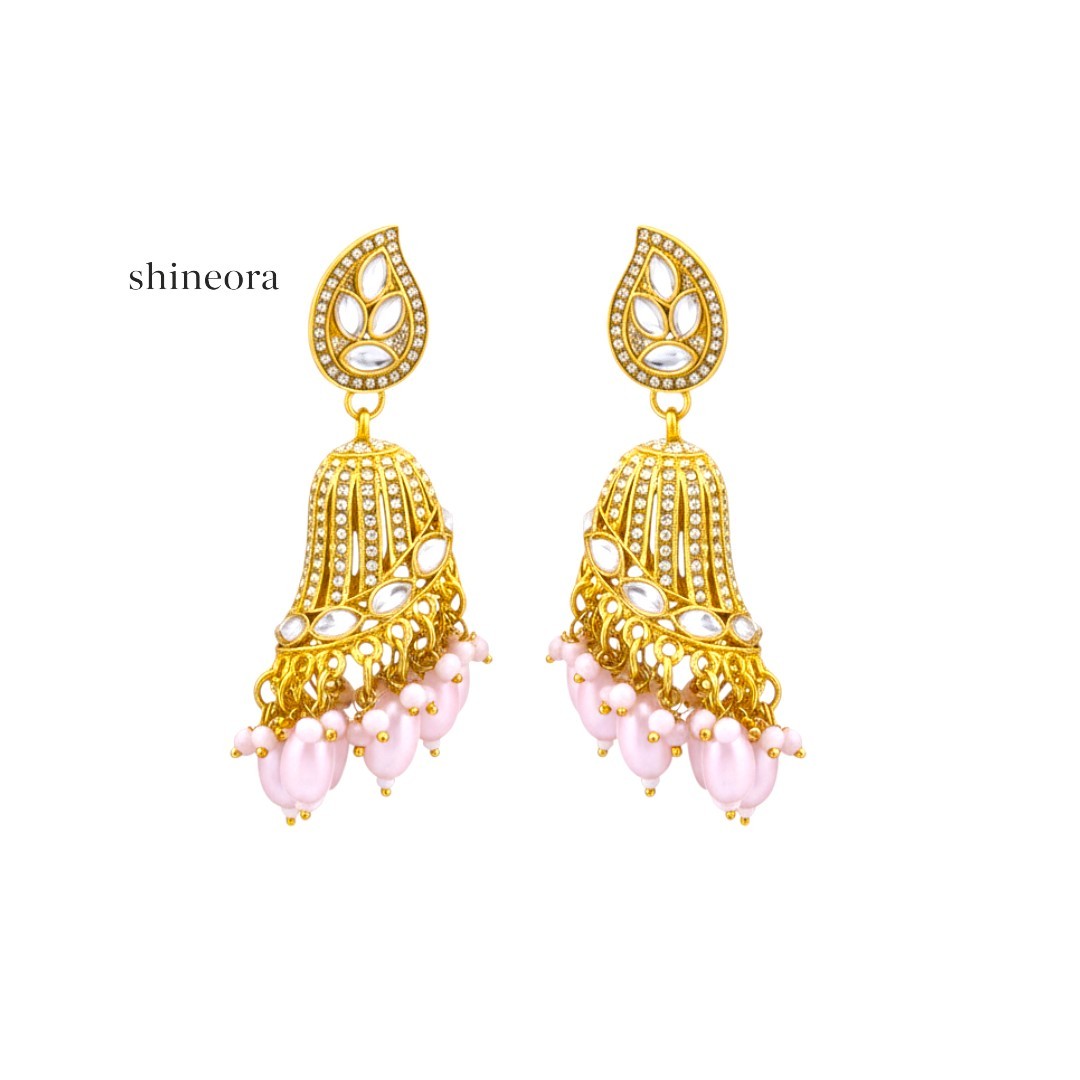 Grace redefined — the Shineora Gulbahar Pearl Jhumka is a breathtaking fusion of royal charm and delicate femininity. Crafted in a luxurious 1-gram gold finish, these dual-layered jhumkas feature intricate Kundan-style detailing, soft pink pearl drops, and cascading strings of classic white pearls that frame your face with regal allure.