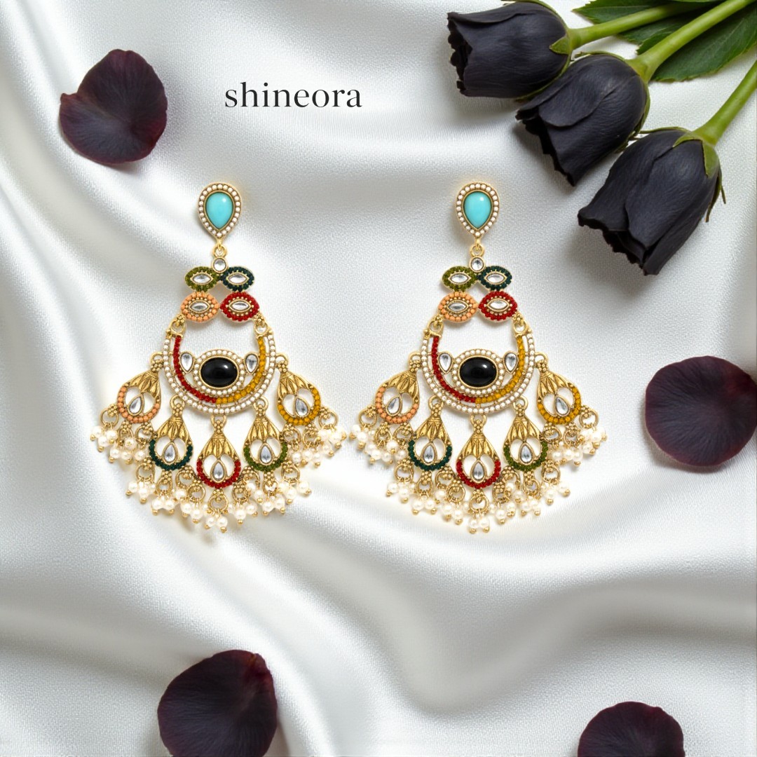 Elevate your festive and wedding look with these handcrafted multicolour kundan statement earrings, designed to add royal charm to any outfit. Featuring a stunning combination of mirror work, enamel detailing, pearls, and a striking central stone, these earrings beautifully blend tradition and modern glamour.