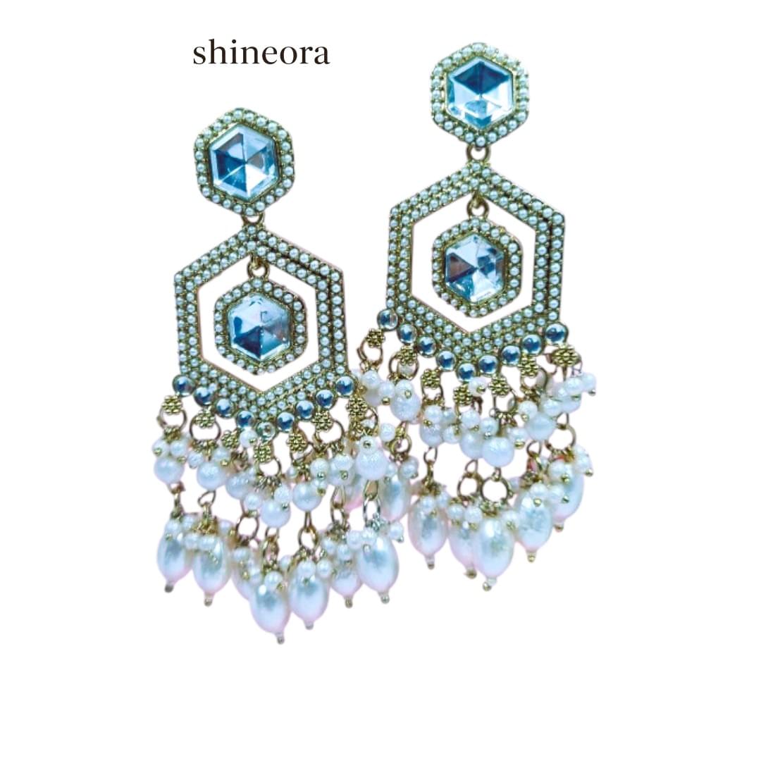 Embrace a wave of sophistication with the Shineora Azure Elegance Earrings, a stunning creation that perfectly blends contemporary design with royal charm. The statement hexagonal frames are embellished with sparkling blue stones, surrounded by intricate detailing and finished with cascading clusters of lustrous white pearls.