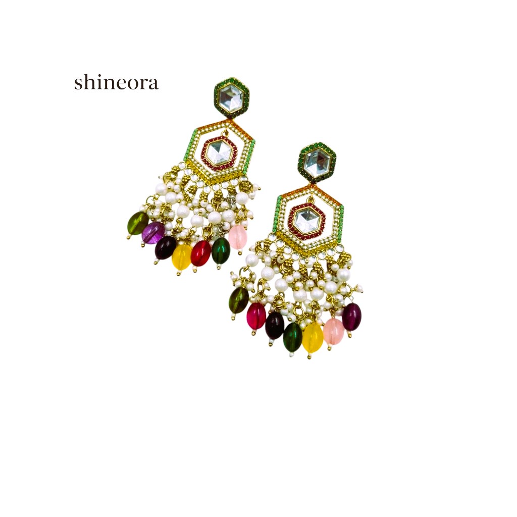 These statement earrings feature dazzling mirror-cut stones at the center, outlined with green and orange enamel accents, cascading white pearls, and bold multicolored beads. The hexagonal frame adds a modern twist to this regal traditional design, making it a perfect pick for weddings, festivals, and grand celebrations.