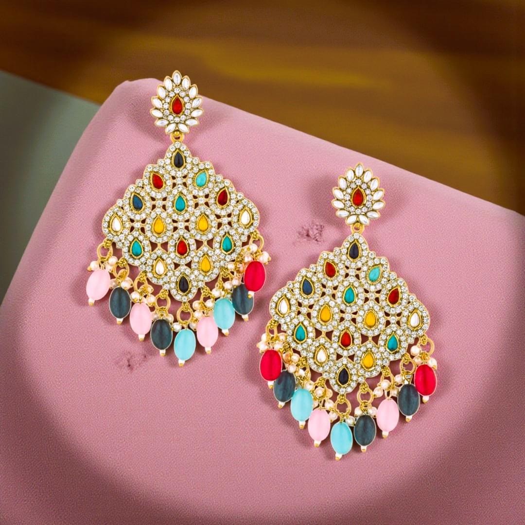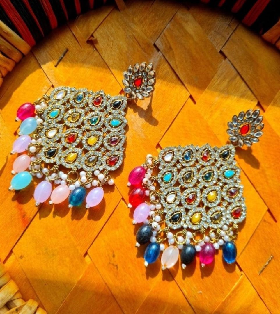 Every element — from the intricate stonework to the radiant gem palette — reflects the richness of royal heritage and modern celebration. Perfect for weddings, sangeet, or festive occasions, these earrings are designed to make you stand out with grace and glamour.