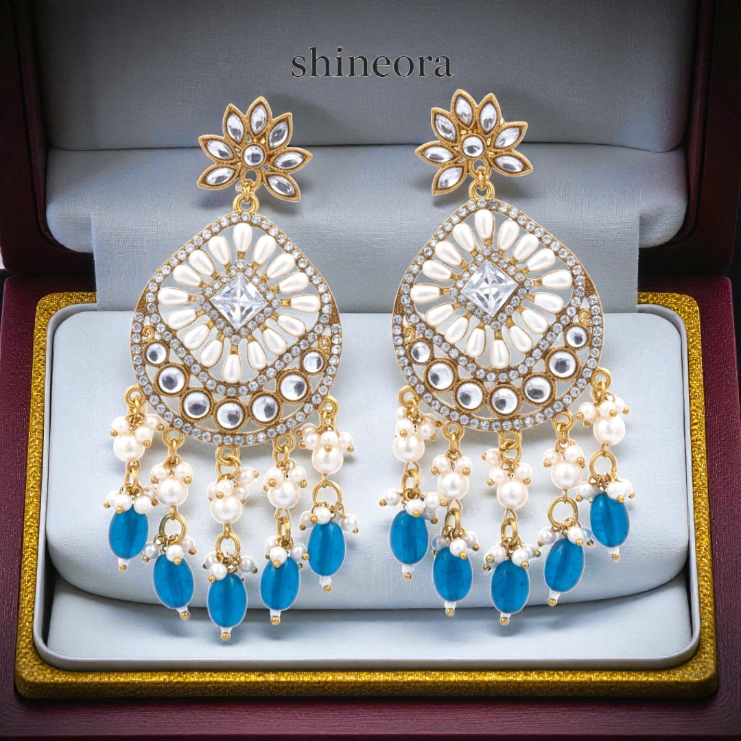 Dazzle in timeless sophistication with the Shineora Emerald Aura Chandbali Earrings, a royal masterpiece that blends traditional elegance with modern artistry. Handcrafted in a premium 1-gram gold finish, these earrings feature a stunning floral top, intricate Kundan-style detailing, and an ornate teardrop design adorned with brilliant white stones and lustrous pearls.