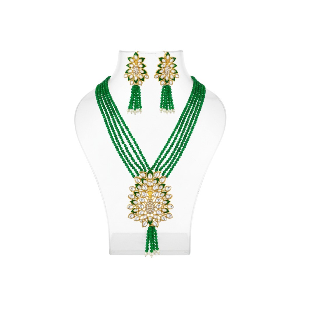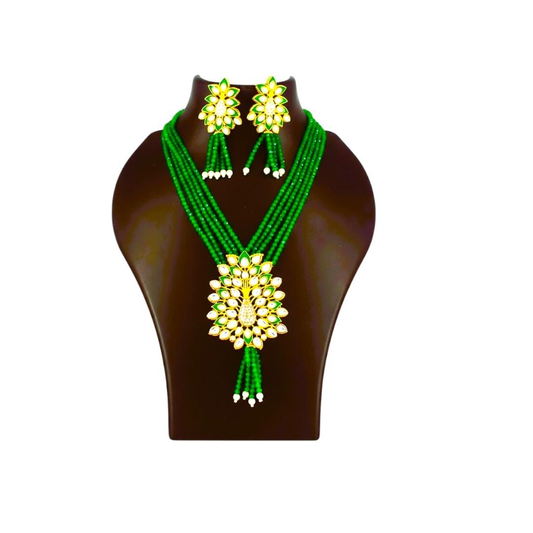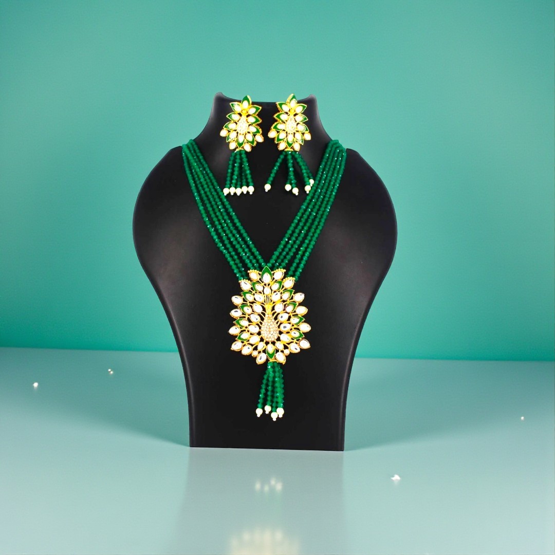 Elevate your festive and wedding look with our Emerald Blossom Kundan Beads Necklace Set, crafted with premium quality kundan stones and rich multi-layer emerald beads.