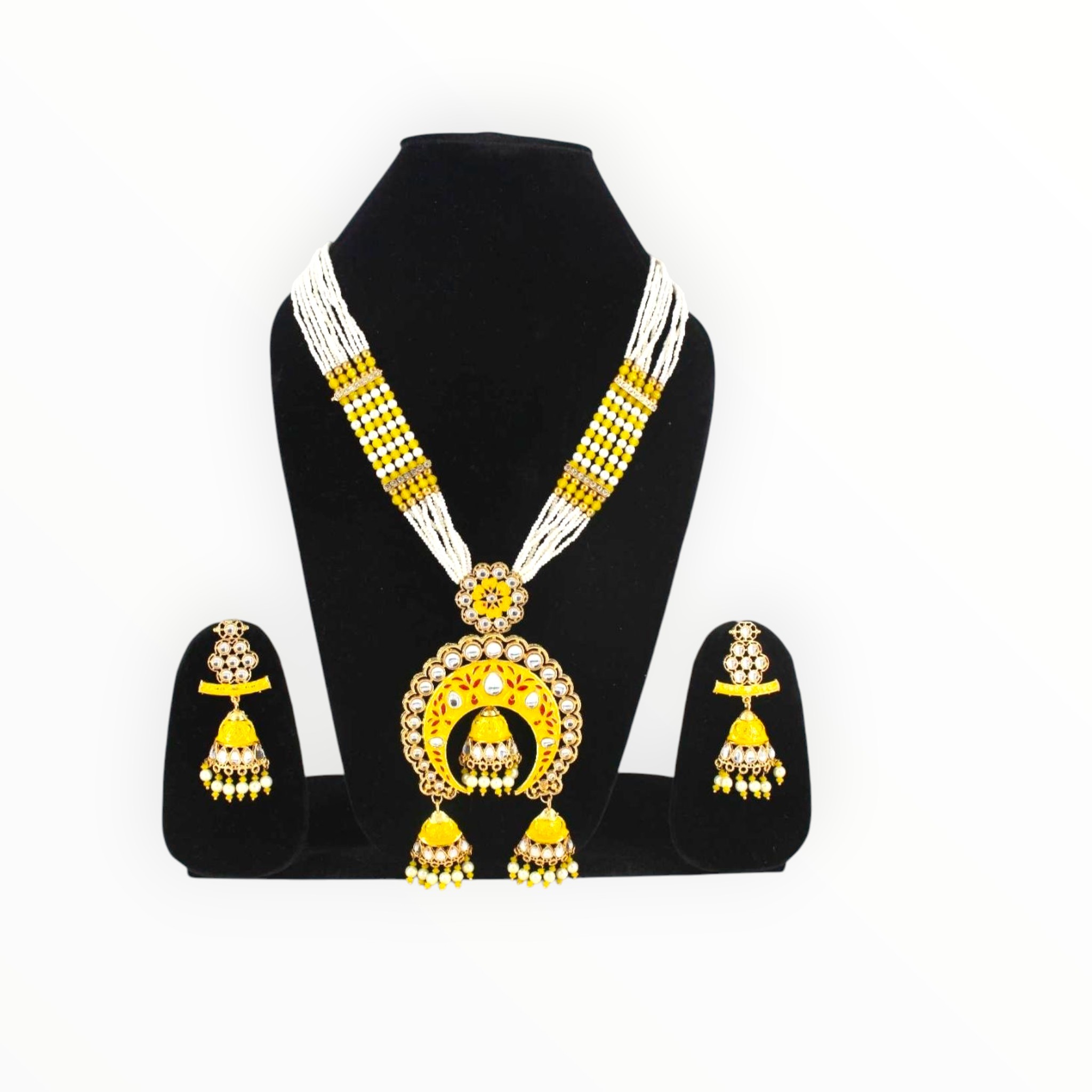 Designed with elegant multi-strand pearl beading, this set features a bold crescent-shaped yellow enamel pendant adorned with premium kundan stones and delicate hanging jhumkas.