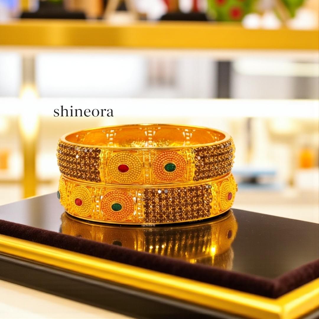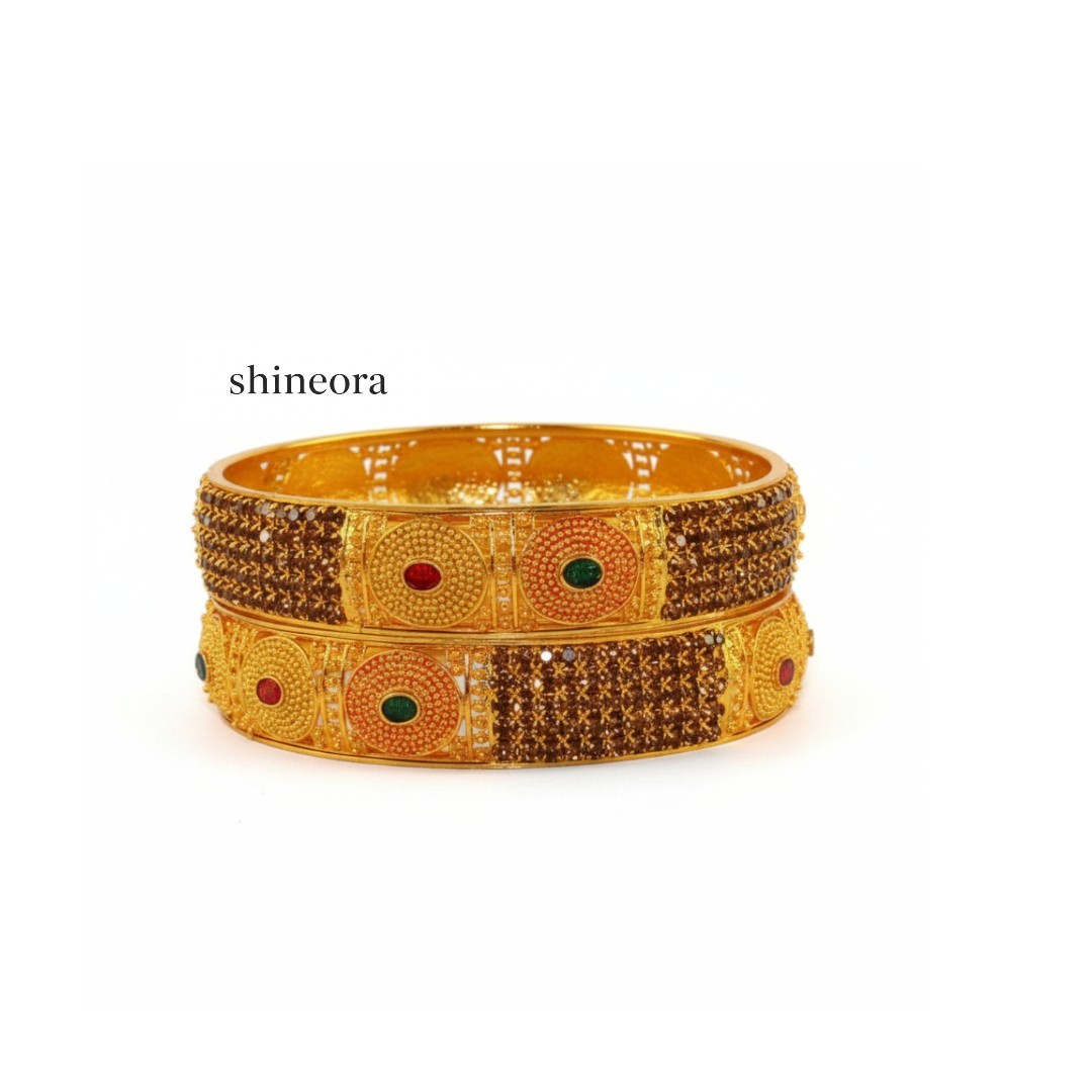 Elevate your traditional ensemble with these exquisite SHINEORA Gold-Plated bangles. This stunning set of two bangles features an intricate circular pattern design adorned with vibrant red and green stones. The bangles showcase masterful craftsmanship with detailed granular work in a mesmerising combination of textured and smooth surfaces. Each bangle displays beautifully crafted circular medallions with alternating red and green stone embellishments, complemented by sections of rich textural detailing. The gleaming gold-plated finish adds a luxurious touch, making these bangles perfect for special occasions, festivals, or traditional ceremonies. The traditional design elements are balanced with contemporary styling, making them versatile enough to pair with both ethnic and modern attire. These bangles are ideal for adding a touch of elegance to your jewellery collection and make for a treasured accessory that captures the essence of Indian artistry.