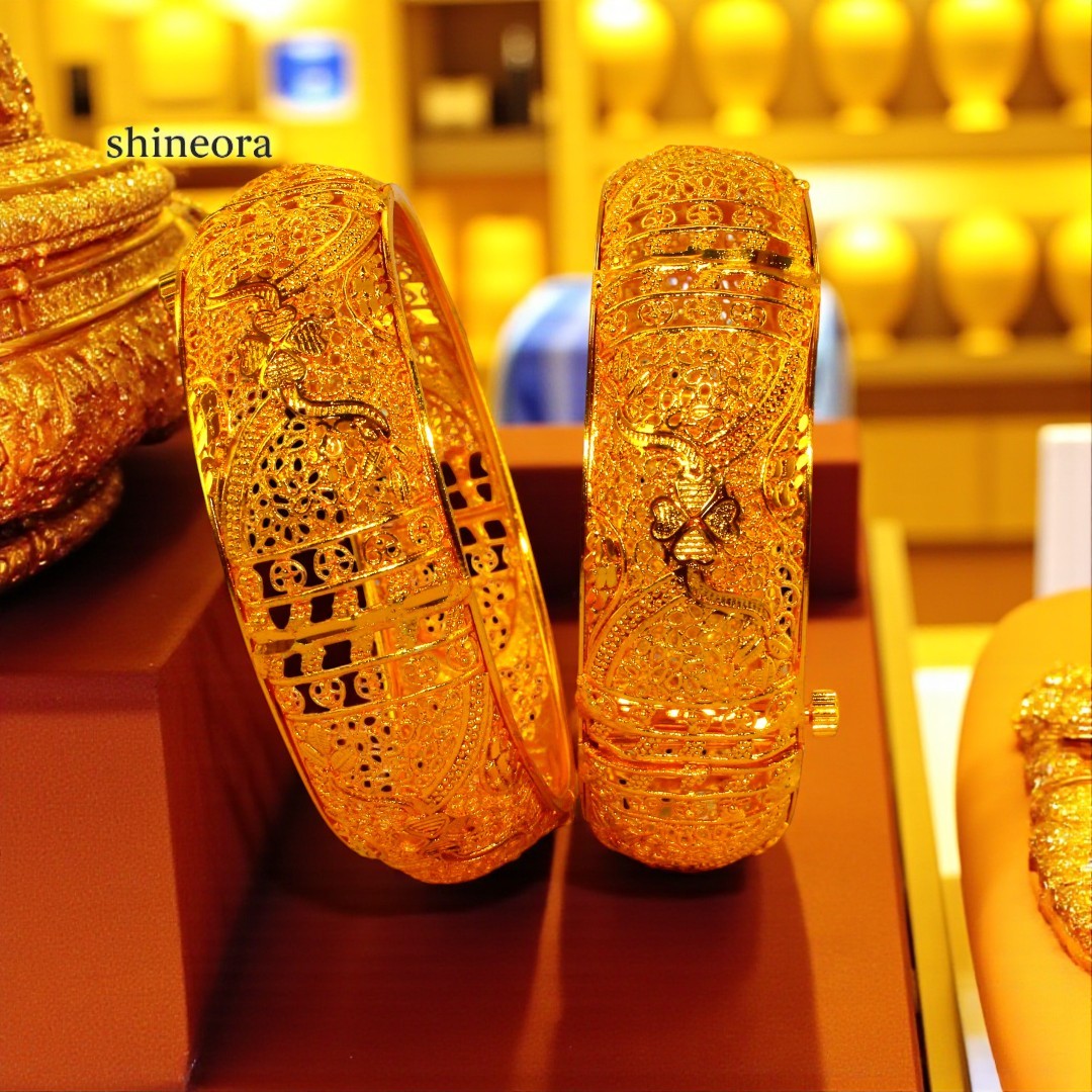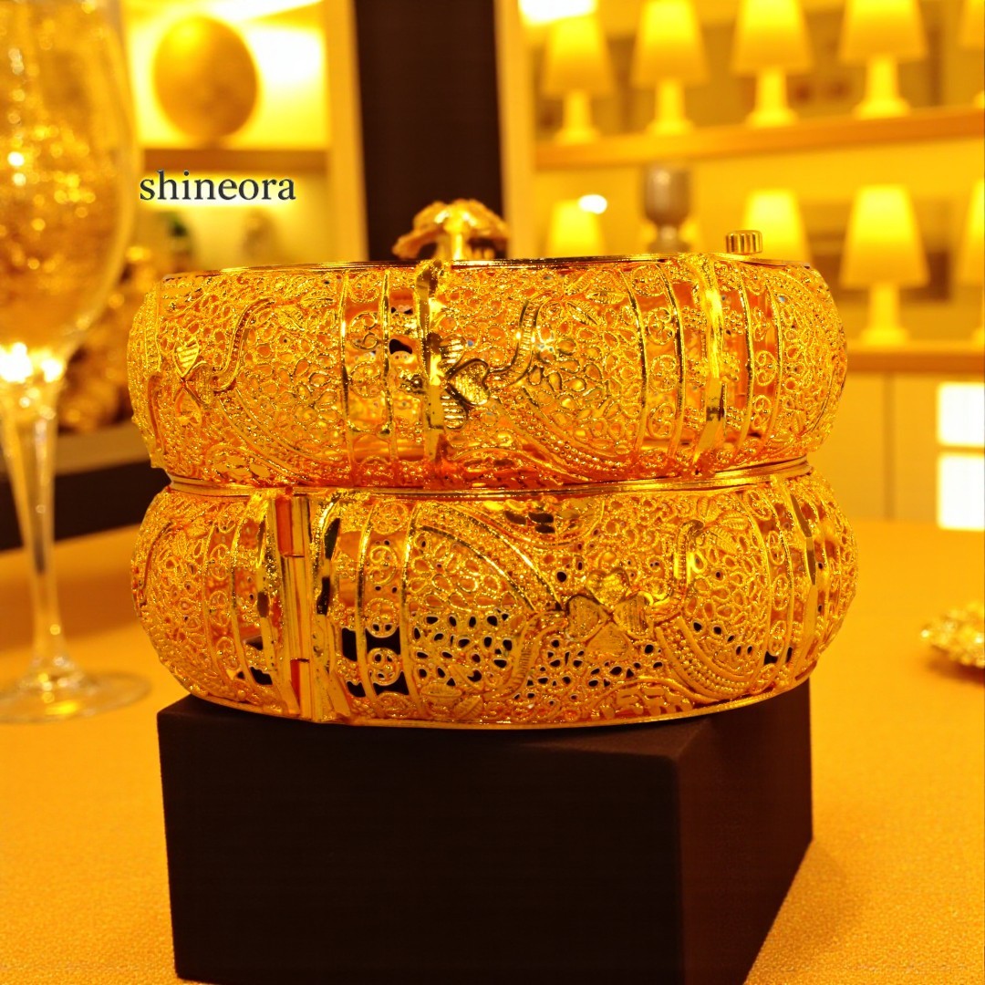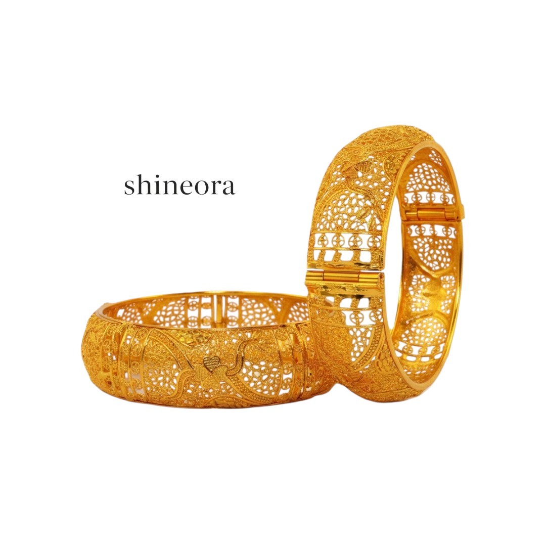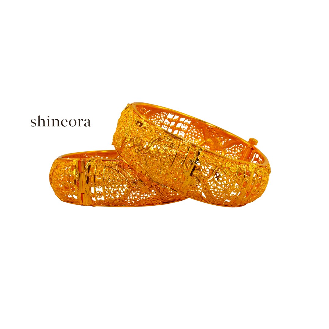 Adorn your wrists with this exquisite gold-toned filigree bangle set from Shineora that exemplifies traditional artistry. Each bangle features intricate lacework patterns meticulously crafted with delicate filigree details, creating a mesmerizing play of light through its ornate openwork design. The bangles are openable, making them convenient to wear and suitable for various wrist sizes. The set showcases a stunning combination of classic aesthetics and contemporary wearability, perfect for both festive occasions and special events. The rich golden hue adds a touch of royal elegance, while the traditional design elements make it a timeless addition to your jewelry collection. These bangles can be paired beautifully with both traditional Indian attire and modern ensembles, offering versatile styling options. The intricate craftsmanship and attention to detail make this bangle set a statement piece that’s sure to draw admiring glances.