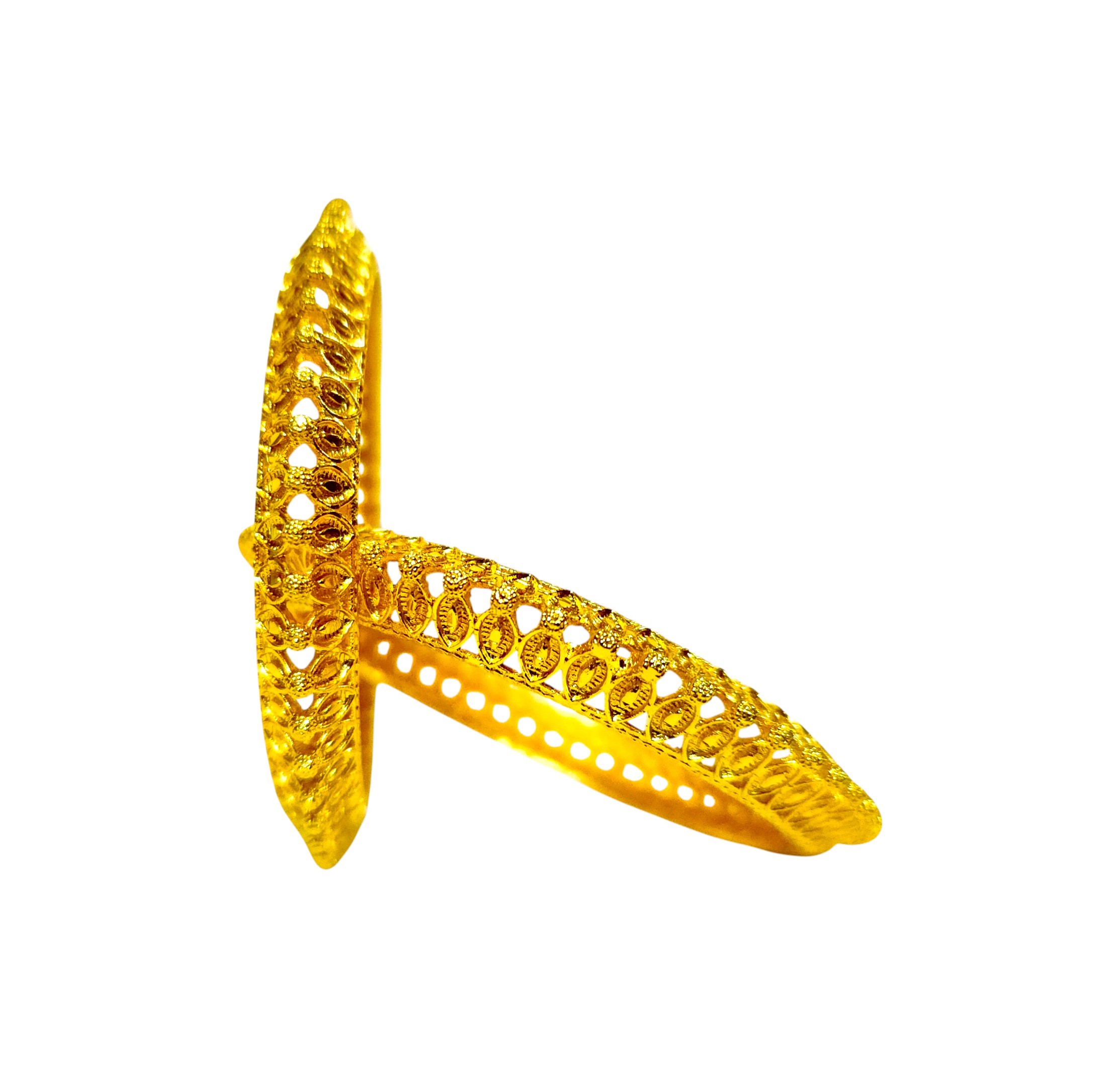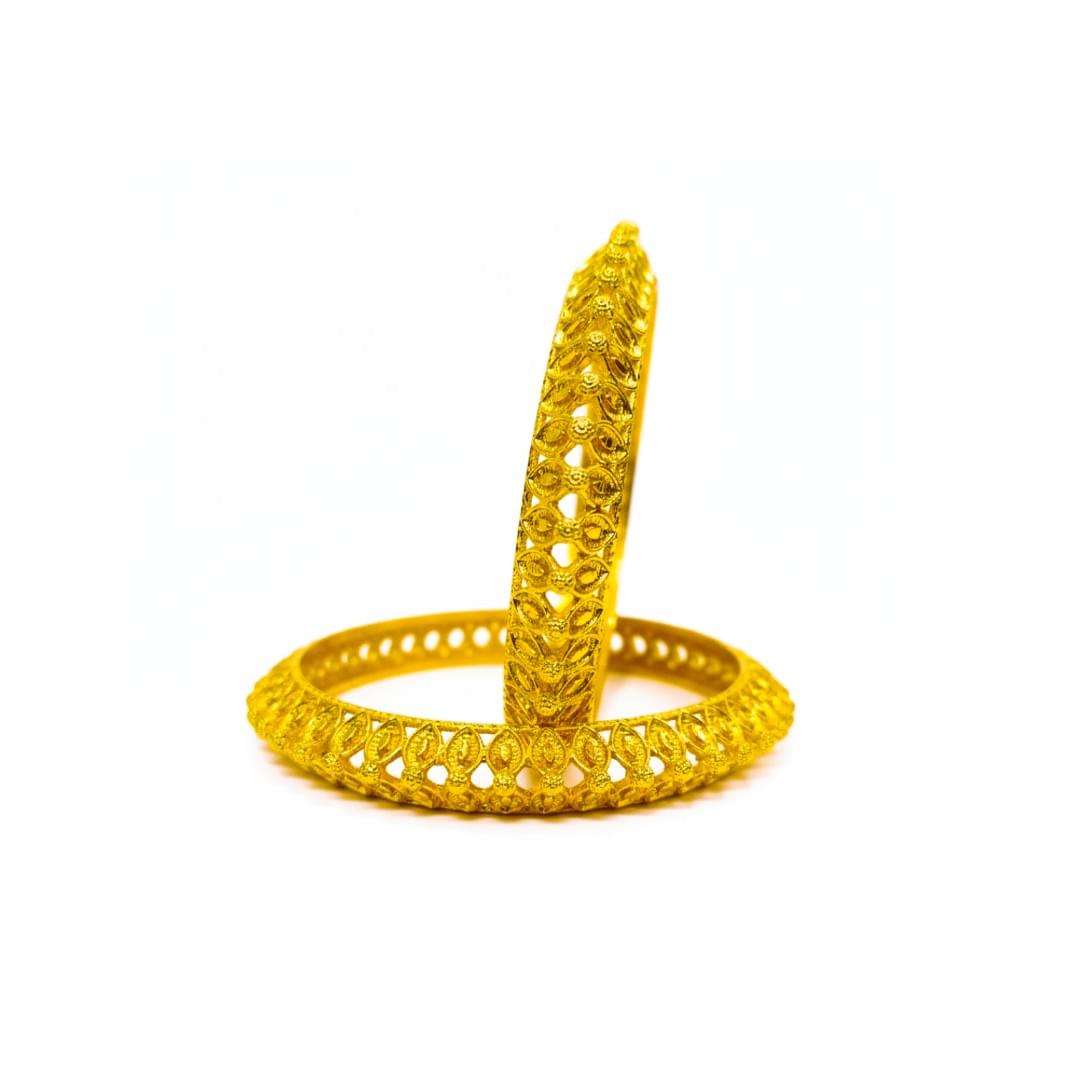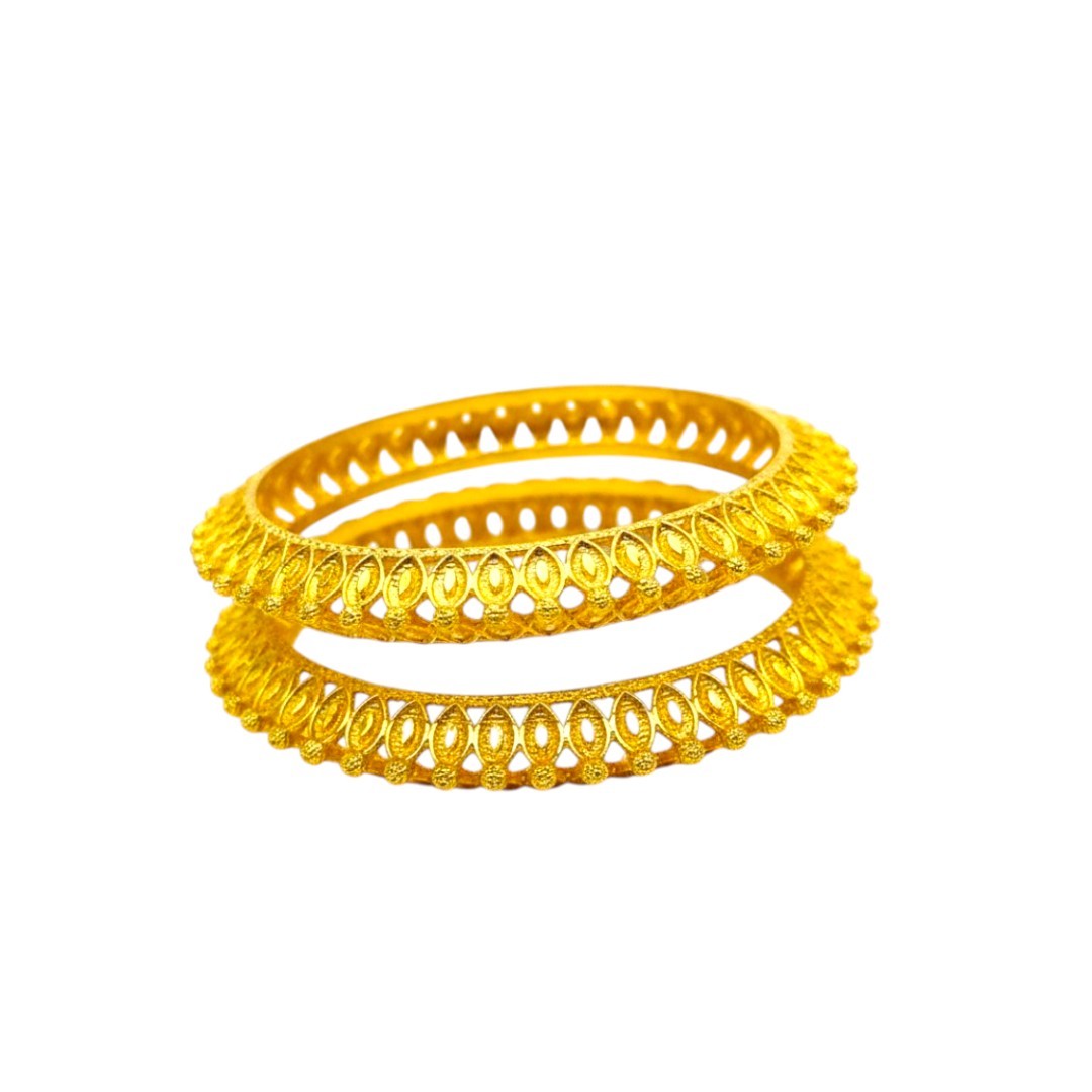 Elevate your traditional ensemble with this exquisite pair of gold-plated bangles from SHINEORA. These intricately designed bangles showcase a stunning cutwork pattern that allows light to dance through the metalwork, creating a mesmerizing play of shadows. The set features two matching bangles crafted with precise detailing, displaying a sophisticated ethnic design that speaks volumes about Indian craftsmanship. The traditional pattern incorporates delicate heart-shaped perforations arranged in a symmetrical format, adding both visual appeal and lightweight comfort. These bangles are perfect for festive occasions, weddings, or any traditional celebration where you want to make a statement. The rich golden hue complements both traditional and contemporary attire, making these versatile accessories for your jewelry collection. The intricate cutwork not only enhances the aesthetic appeal but also ensures comfortable wear during long hours of celebration. These bangles serve as an ideal choice for those who appreciate the blend of traditional design with contemporary styling.