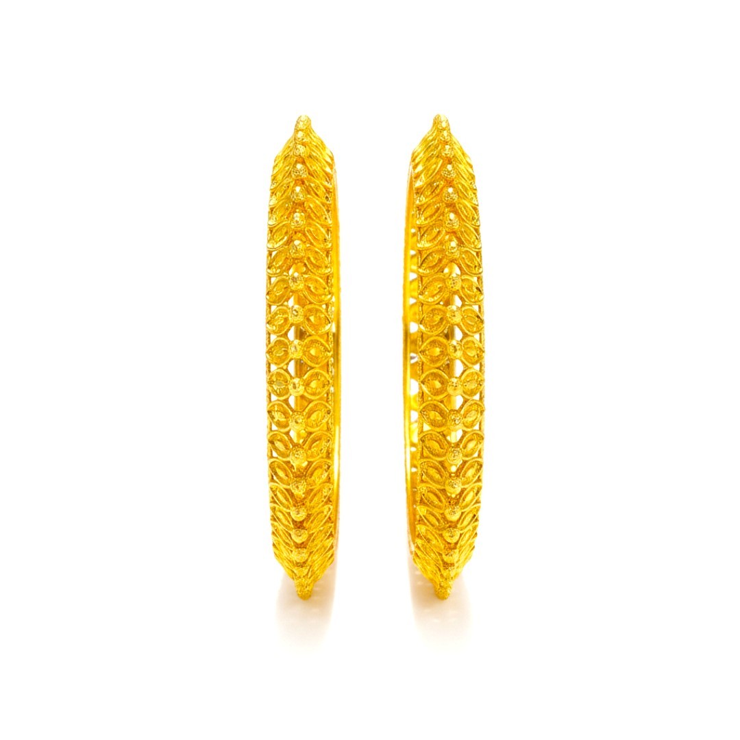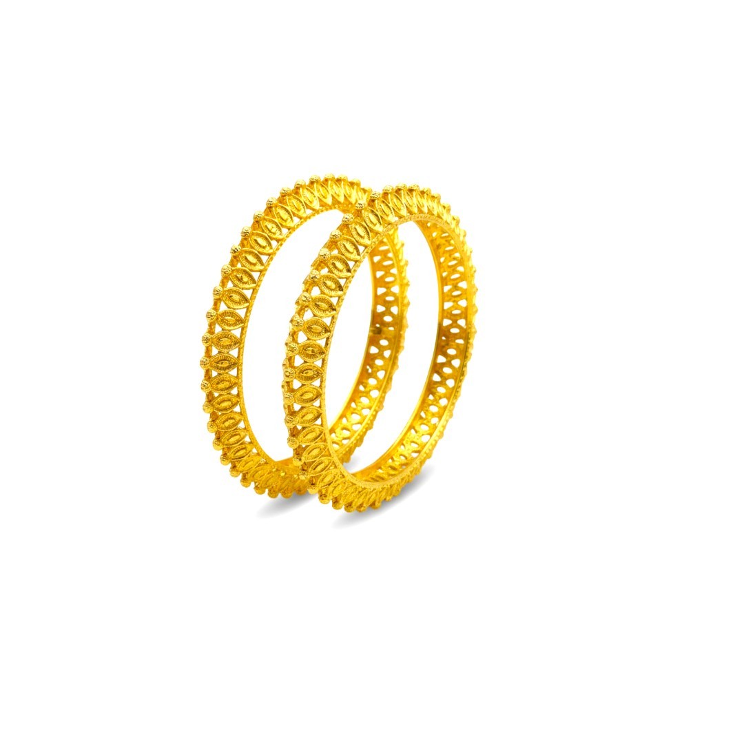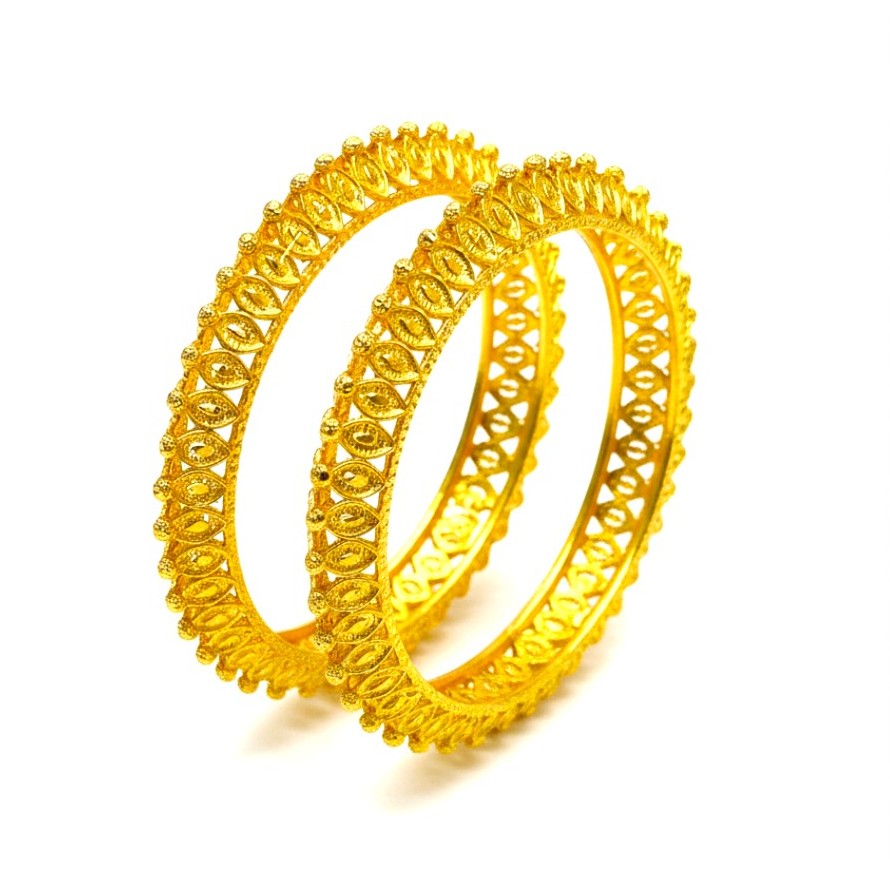 Elevate your traditional ensemble with this exquisite pair of gold-plated bangles from SHINEORA. These intricately designed bangles showcase a stunning cutwork pattern that allows light to dance through the metalwork, creating a mesmerizing play of shadows. The set features two matching bangles crafted with precise detailing, displaying a sophisticated ethnic design that speaks volumes about Indian craftsmanship. The traditional pattern incorporates delicate heart-shaped perforations arranged in a symmetrical format, adding both visual appeal and lightweight comfort. These bangles are perfect for festive occasions, weddings, or any traditional celebration where you want to make a statement. The rich golden hue complements both traditional and contemporary attire, making these versatile accessories for your jewelry collection. The intricate cutwork not only enhances the aesthetic appeal but also ensures comfortable wear during long hours of celebration. These bangles serve as an ideal choice for those who appreciate the blend of traditional design with contemporary styling.