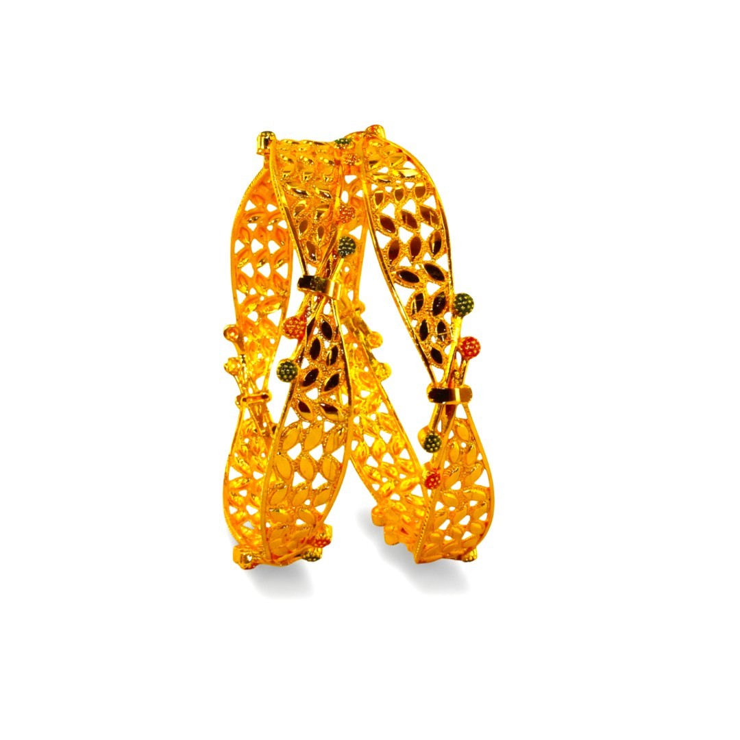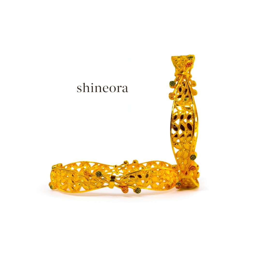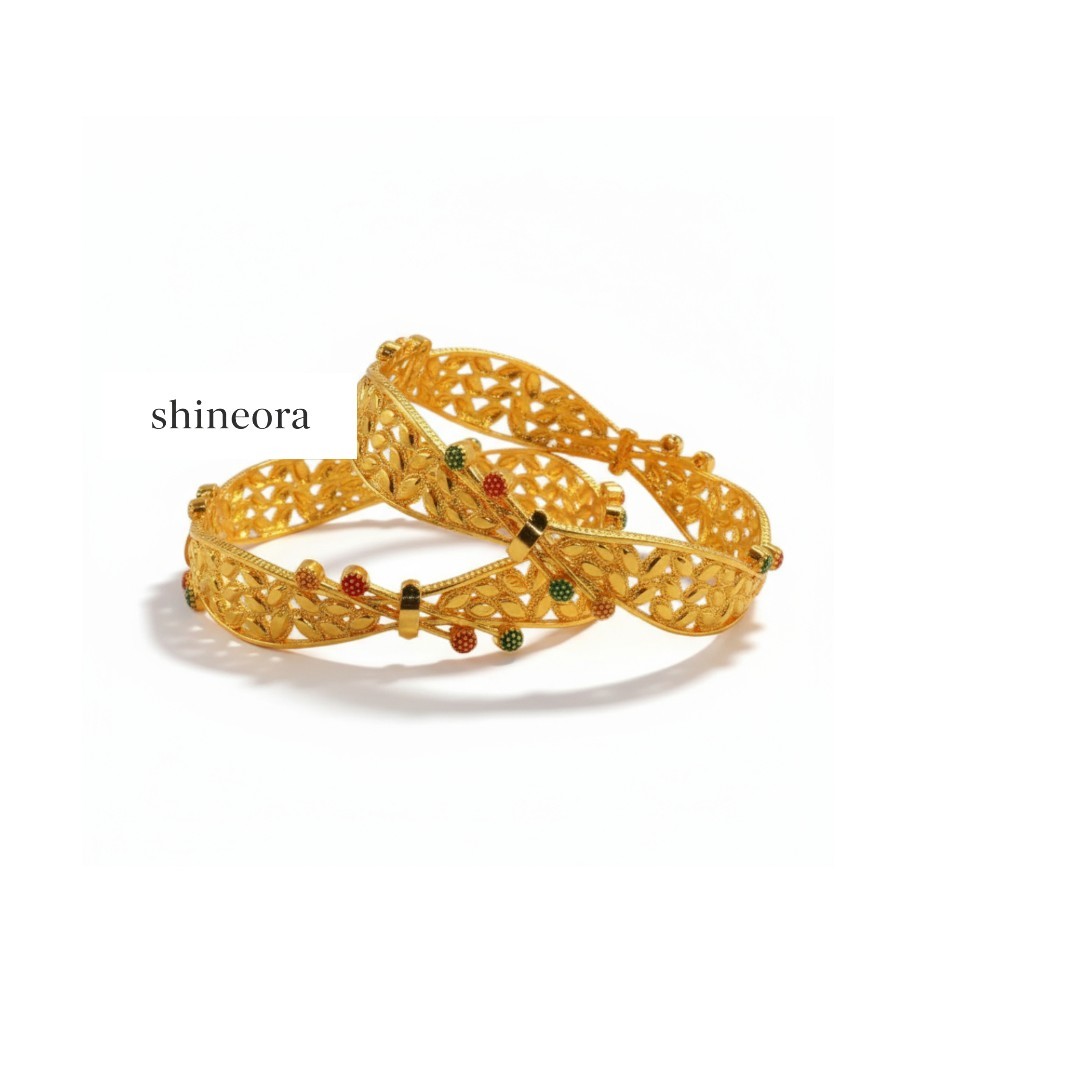 Elevate your traditional ensemble with this exquisite gold-plated bangle set from SHINEORA. Each piece showcases intricate filigree work with a mesmerising lattice pattern that allows light to dance through its delicate openwork design. The bangles feature a sophisticated blend of traditional craftsmanship and contemporary style, adorned with charming multicoloured beaded accents in green and coral hues. The set’s ornate design includes beautiful floral motifs and geometric patterns that create a stunning three-dimensional effect. These bangles are perfect for special occasions, festivals, or whenever you want to add a touch of elegance to your outfit. The sophisticated gold plating gives these bangles a rich, luxurious finish while maintaining a lightweight feel for comfortable wear. The clever combination of classic design elements with modern aesthetics makes this set a versatile addition to any jewellery collection, suitable for both traditional wear and fusion fashion statements.