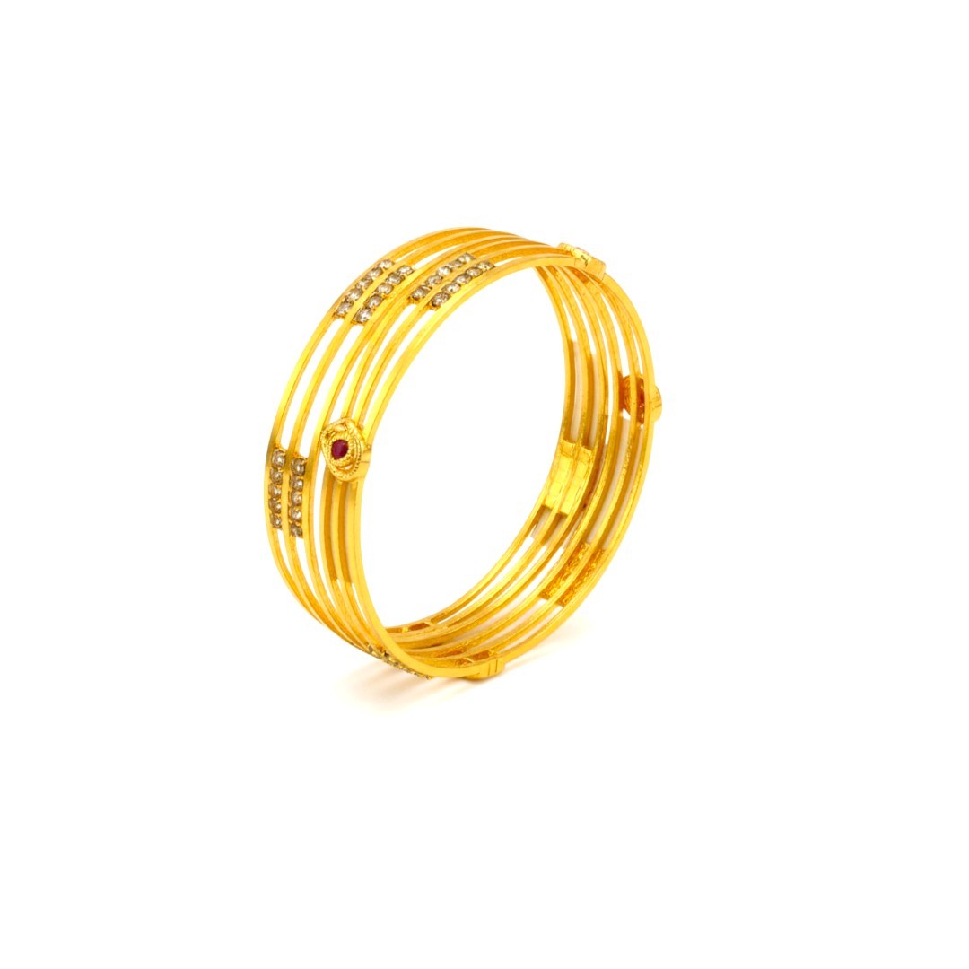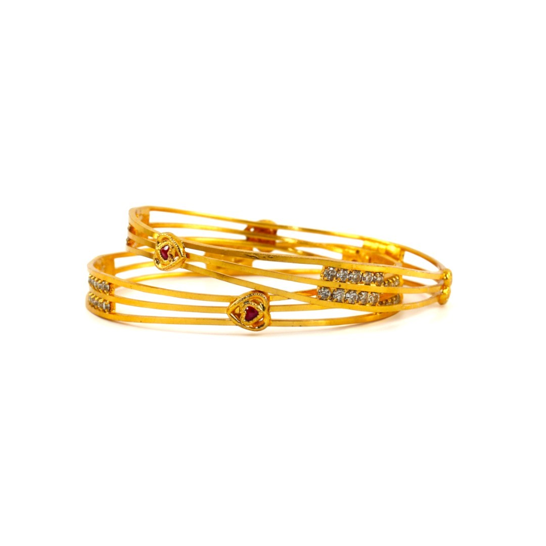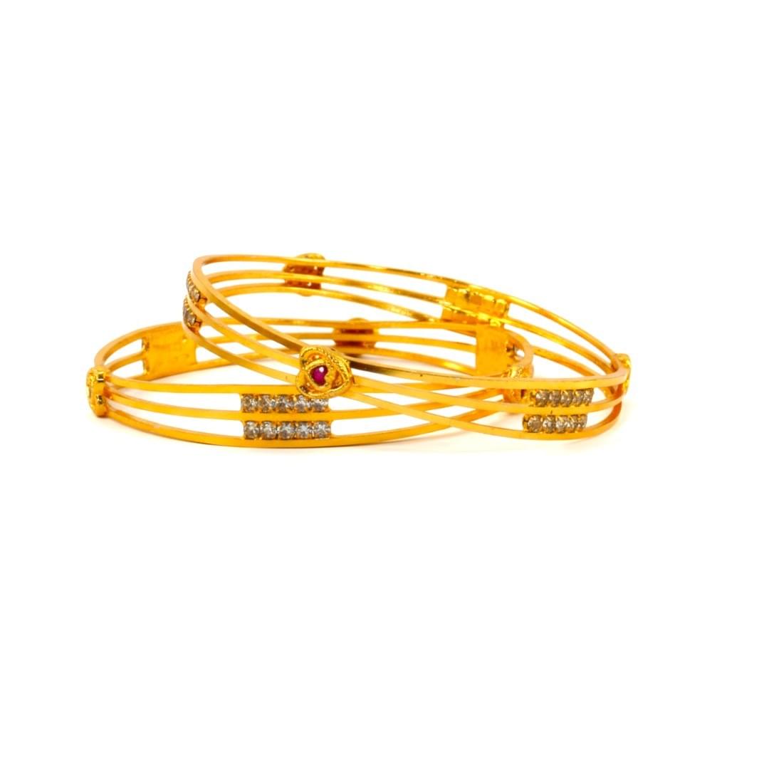 Elevate your traditional ensemble with this exquisite set of two gold-plated bangles from Shineora. These multi-layered bangles feature an intricate design with delicate crystal embellishments that catch and reflect light beautifully. The sophisticated pattern combines parallel bands adorned with sparkling crystals and decorative circular motifs with subtle red accents. The layered construction creates a stunning three-dimensional effect while maintaining a lightweight feel. Perfect for special occasions and festivities, these bangles can be worn together or separately to complement various outfits. The traditional design elements make them an ideal accessory for both contemporary and classical Indian attire. The durable gold plating ensures long-lasting shine and elegance. These versatile bangles work wonderfully as part of your jewelry collection or as a thoughtful gift for someone special.
