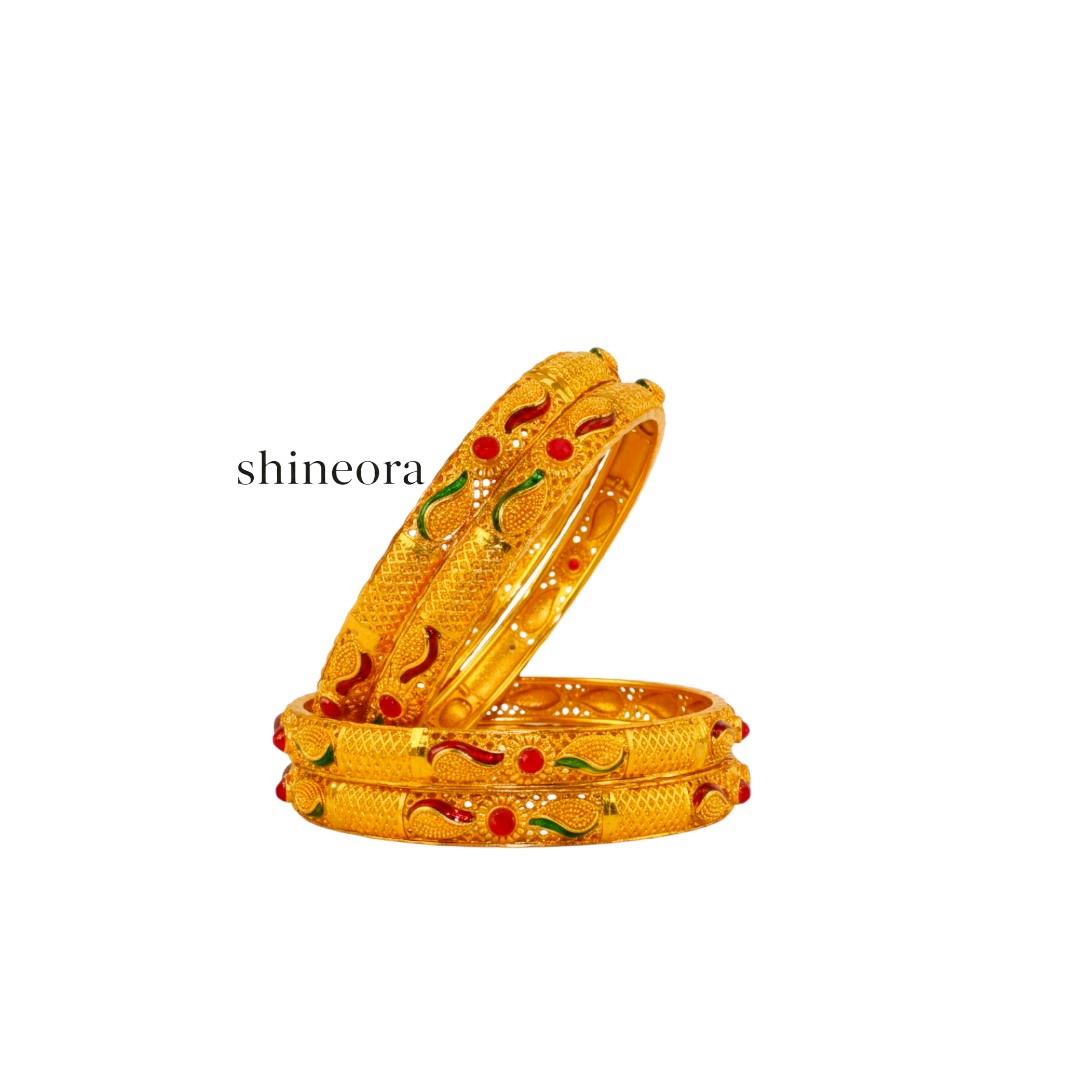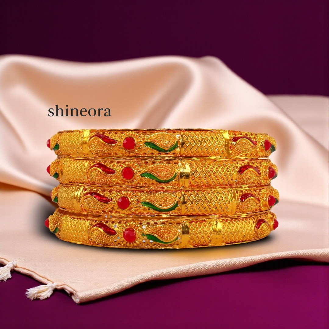 Add a touch of traditional elegance to your ensemble with this exquisite set of 4 gold-plated bangles from SHINEORA. Each bangle showcases intricate paisley patterns meticulously crafted with stunning detail. The bangles feature beautiful red and green enamel work that adds a pop of colour to the gleaming gold-plated surface. The detailed lattice design and geometric patterns give these bangles a rich, ornate appearance that’s perfect for special occasions, festivals, or traditional ceremonies. The set combines classic Indian artistry with contemporary styling, making it versatile enough to complement both traditional and modern outfits. These bangles are ideal for creating a statement look when worn together or can be mixed and matched with other bangles for a personalized style. The traditional design elements and premium finish make this set a treasured addition to any jewellery collection, perfect for gifting or personal adornment.