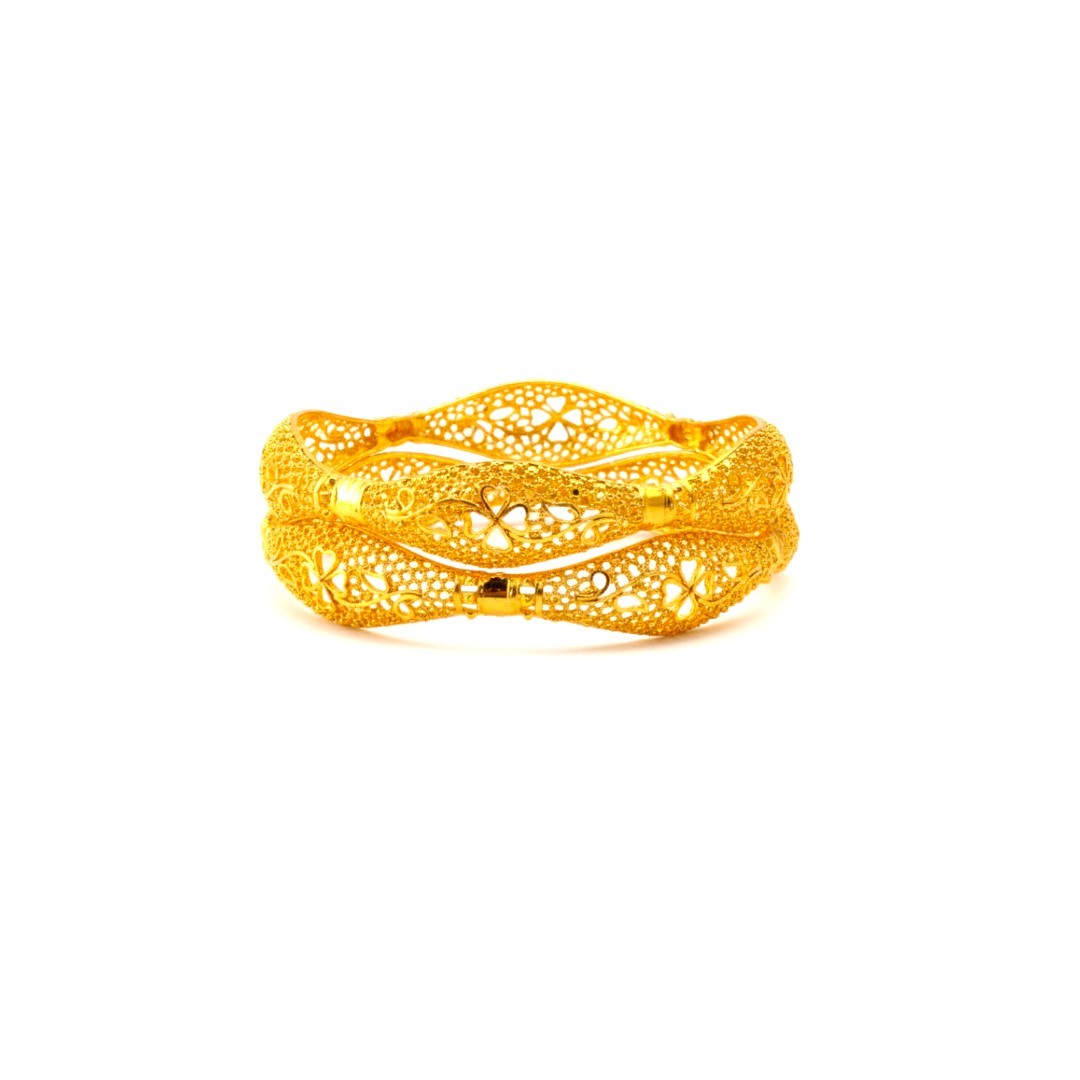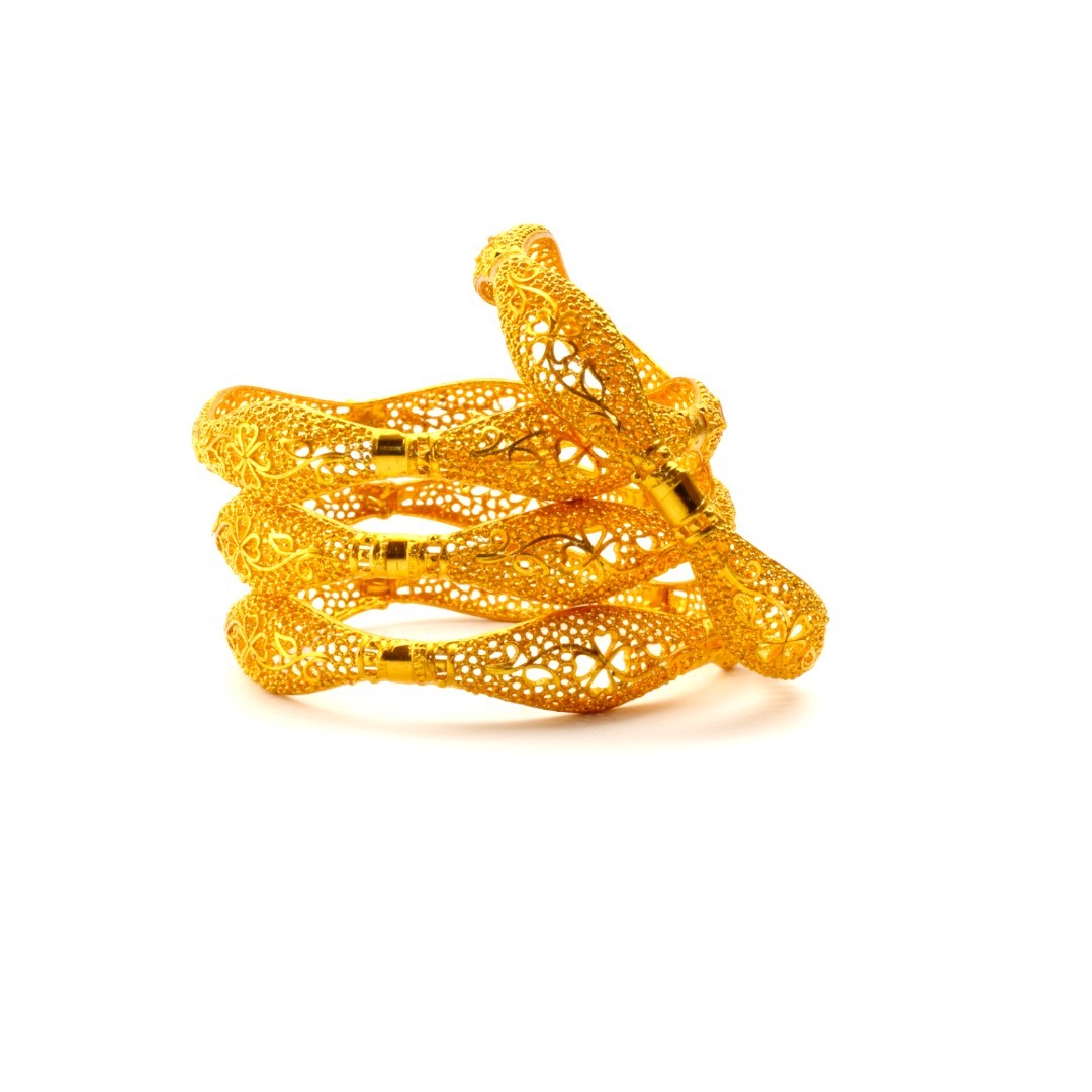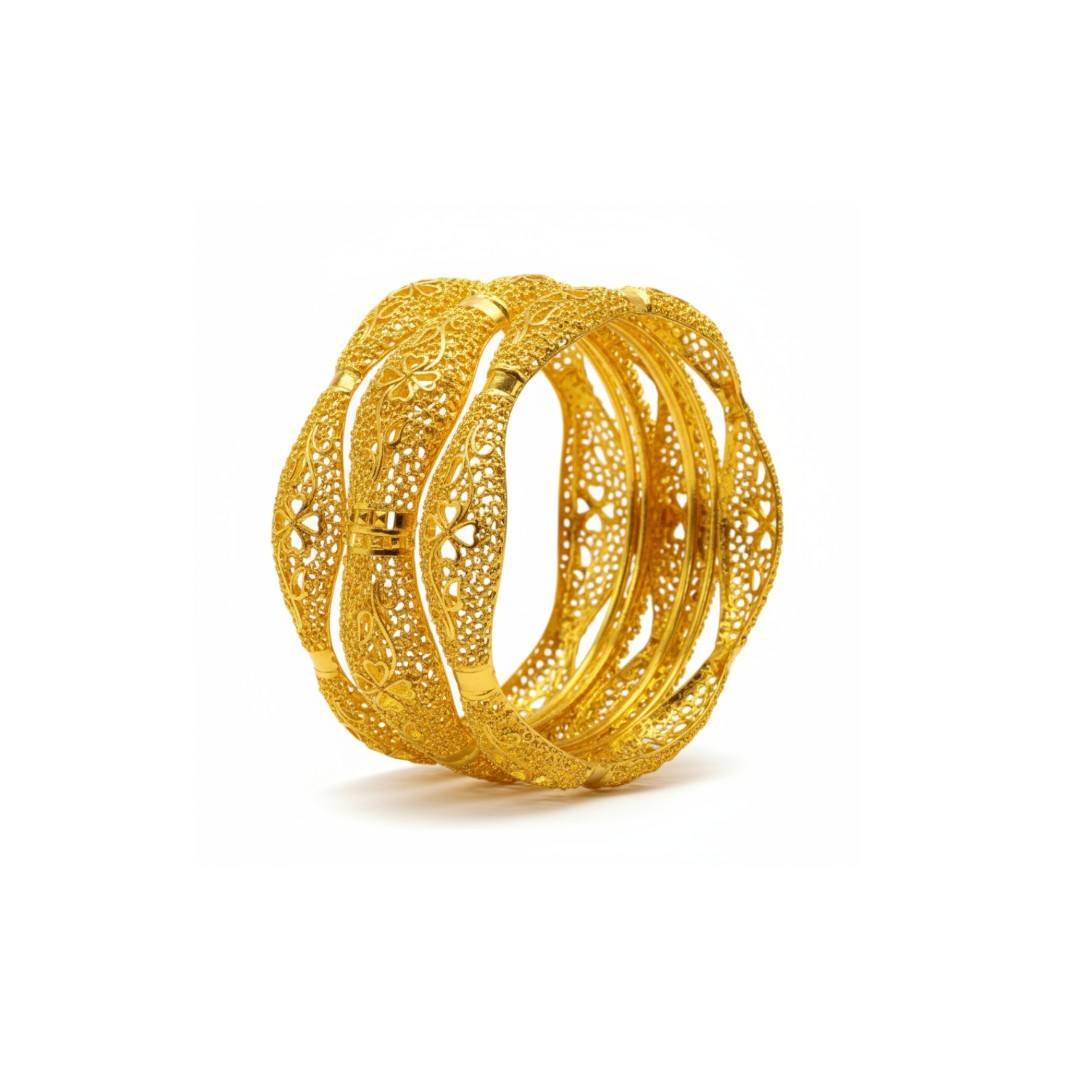 Elevate your traditional ensemble with this exquisite set of 4 gold-plated bangles from SHINEORA. Each piece showcases intricate floral filigree work, creating a mesmerising pattern of delicate flowers and lattice designs. The openable design ensures easy wearing while maintaining a secure fit. These bangles feature a stunning combination of textured and smooth surfaces with precise cutwork detailing that allows light to play through the metalwork, creating a dazzling effect. The traditional craftsmanship is evident in every aspect, from the seamless joints to the perfectly balanced weight. Perfect for festive occasions, weddings, or any traditional celebration, these bangles can be worn together as a set or individually for a subtle statement. The versatile design complements both contemporary and traditional outfits, making it a must-have addition to your jewellery collection. The rich golden finish adds a touch of luxury and sophistication to your overall look.