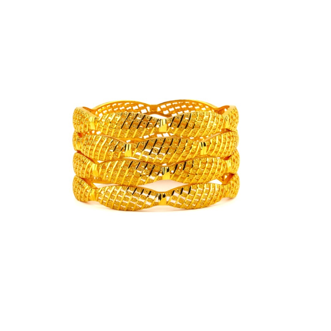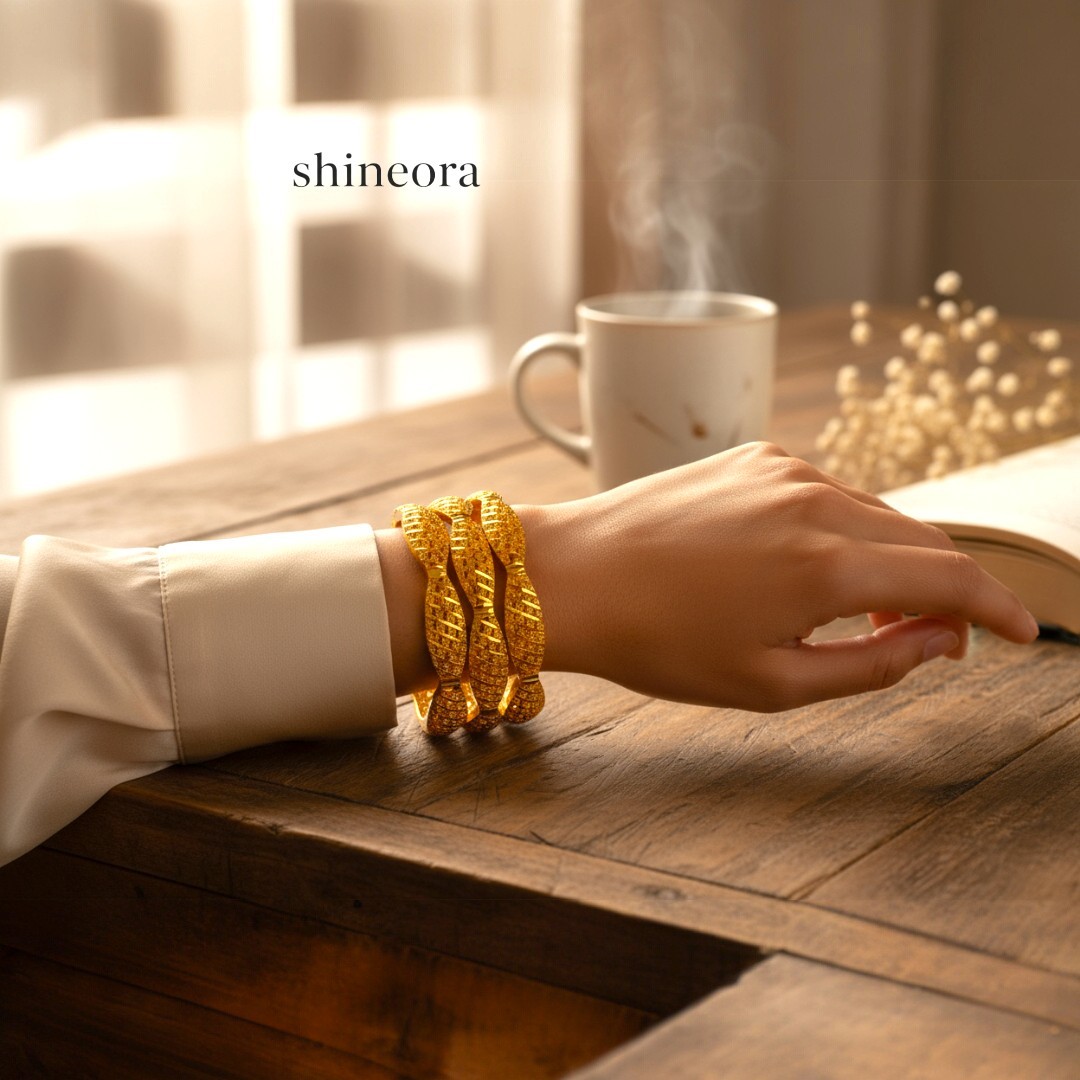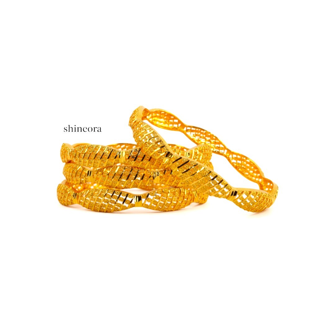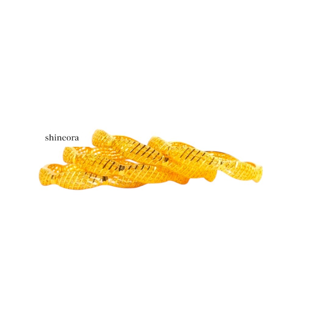 Elevate your traditional ensemble with this exquisite set of four gold-plated bangles from Shineora. Each bangle showcases a mesmerising wave pattern design with intricate openwork detailing that catches light beautifully. The sophisticated lattice-like structure combines traditional artistry with contemporary styling, making these bangles perfect for both festive occasions and daily wear. The set features a harmonious blend of geometric patterns and curved elements, creating a luxurious three-dimensional effect. These bangles are expertly crafted with a durable gold plating that adds a rich, lustrous finish to your wrist. The hollow construction ensures comfortable wear while maintaining an elegant appearance. Whether paired with traditional Indian attire or modern fusion wear, this bangle set makes a striking statement piece that’s sure to draw admiration. The versatile design makes it an ideal choice for weddings, festivals, or any special celebration where you want to make a lasting impression.