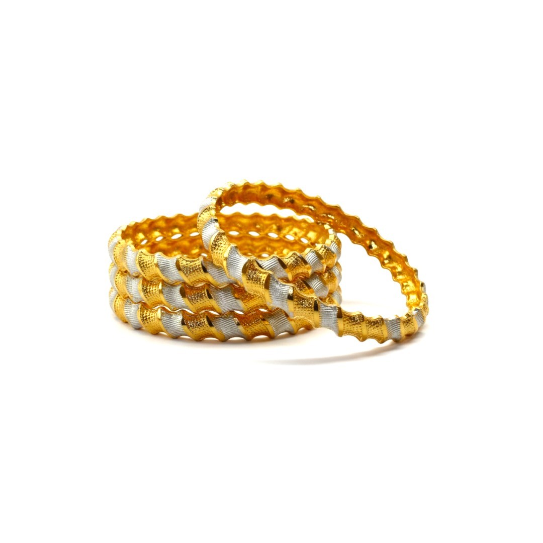 Elevate your traditional ensemble with this exquisite set of four bangles featuring a stunning two-tone design. The artful combination of gold and silver plating creates a mesmerizing pattern that catches light beautifully. Each bangle showcases an intricate textured surface with alternating hammered and ribbed patterns, adding depth and visual interest. The sophisticated wavelike design makes these bangles perfect for both everyday wear and special occasions. These bangles are crafted with attention to detail, featuring a comfortable fit and secure closure. The versatile color combination allows these bangles to complement various outfits and accessories in your wardrobe. Whether worn individually or as a complete set, these bangles make a striking statement while maintaining a classic appeal. Perfect for festivities, celebrations, or adding a touch of glamour to your daily wear, this bangle set represents the perfect fusion of traditional aesthetics and contemporary style.