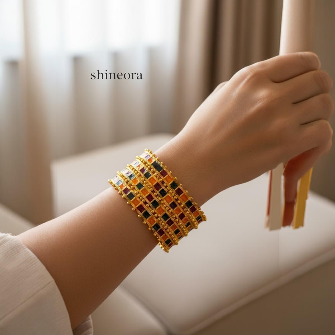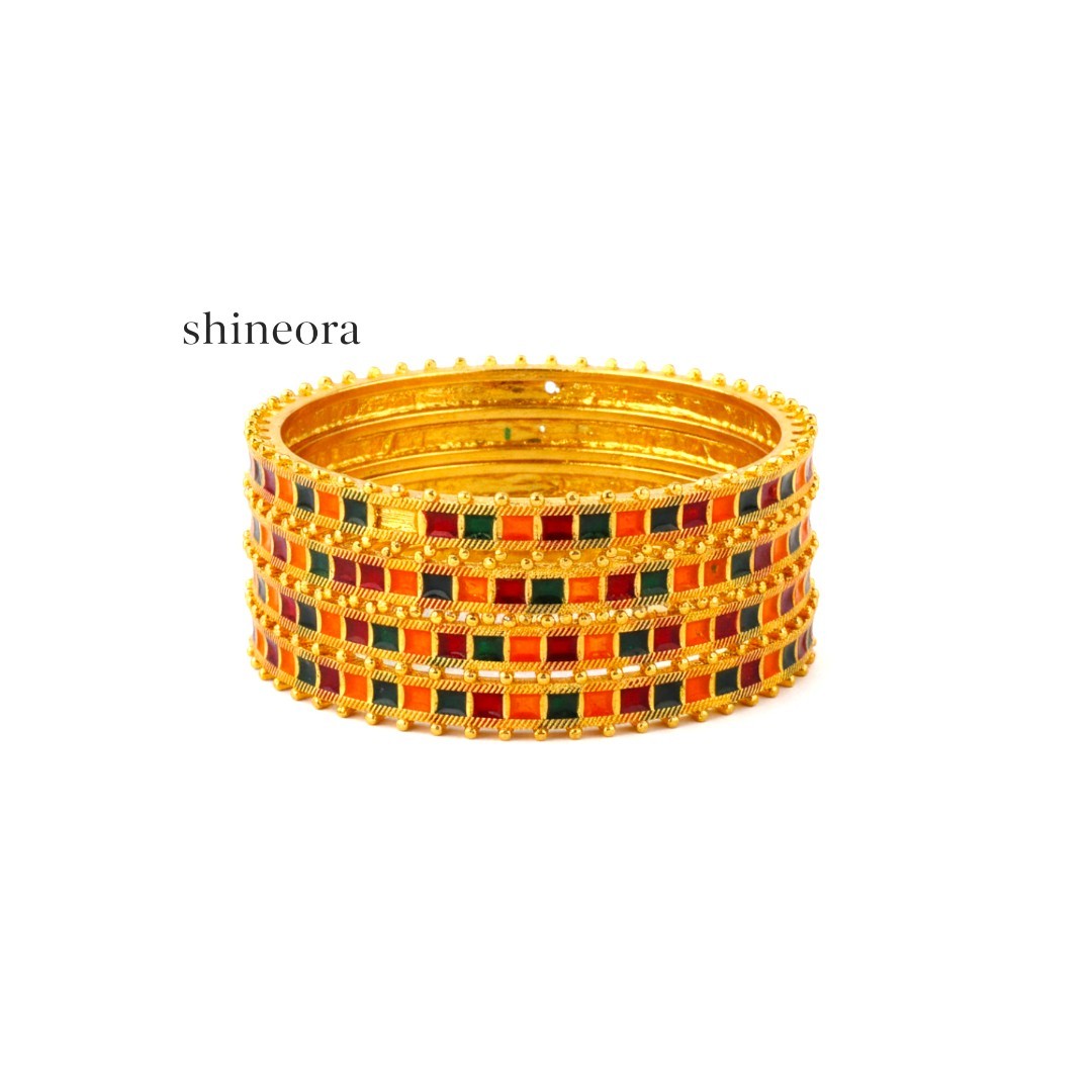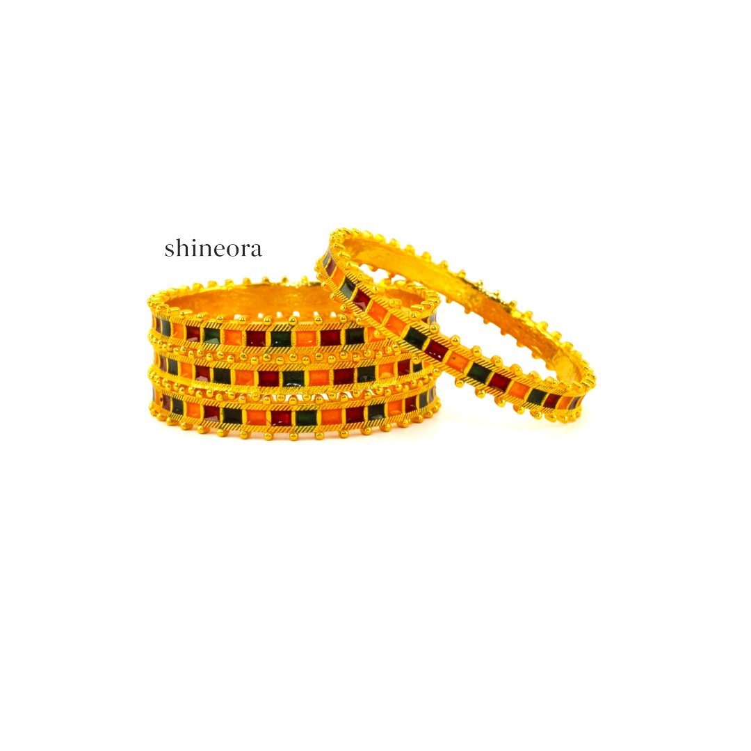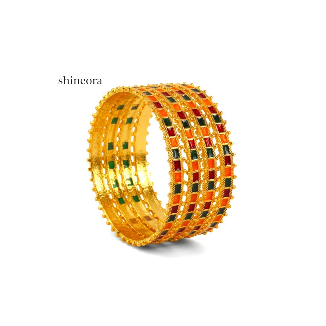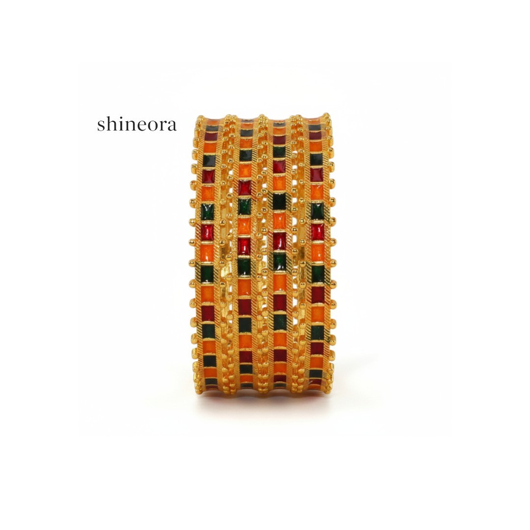 Elevate your traditional attire with this exquisite set of two gold-plated bangles from Shineora. These bangles showcase a stunning combination of craftsmanship and design, featuring intricate multicolor enamel work in vibrant shades of orange, red, and green. The bangles are adorned with a distinctive checkered pattern, beautifully enhanced by delicate golden beading details along the edges. The wide-width design makes these bangles a statement piece, perfect for special occasions and festivities. Each bangle features a meticulous arrangement of square enamel compartments, creating a royal aesthetic that complements both traditional and contemporary ensembles. The rich color palette and ornate detailing make these bangles an ideal choice for weddings, festivals, or any celebration where you want to make a lasting impression. These traditional bangles are crafted to add a touch of elegance to your jewelry collection while maintaining the authenticity of classic Indian design.