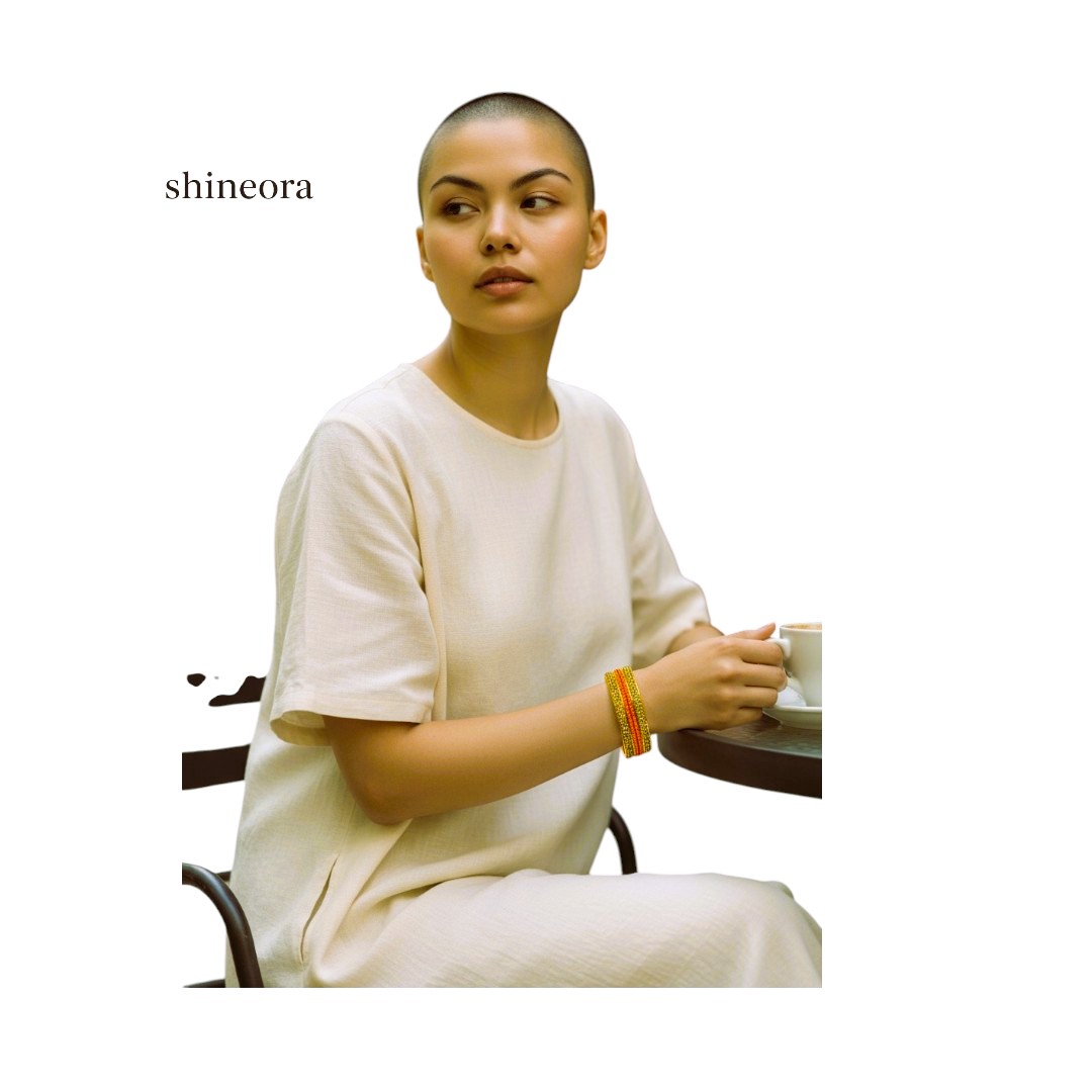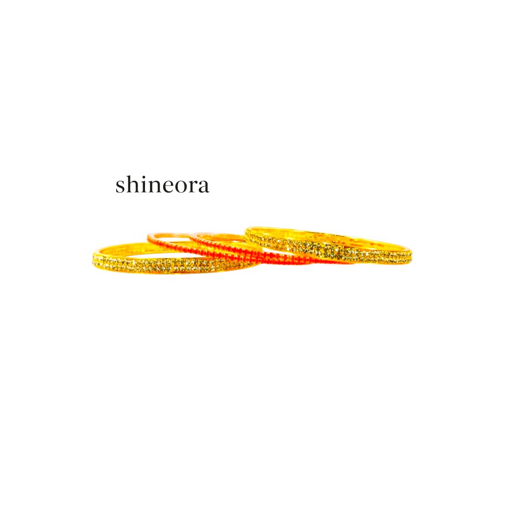 Add a touch of traditional elegance to your ensemble with this stunning set of 4 bangles. The exquisite combination features alternating bands adorned with sparkling crystal rhinestones in gold, complemented by vibrant orange accents. These gold-plated bangles showcase intricate decorative patterns that catch and reflect light beautifully, making them perfect for special occasions and wedding celebrations. The classic design seamlessly blends timeless appeal with contemporary style, suitable for both traditional and modern outfits. Each bangle in the set is crafted with attention to detail, featuring secure construction and comfortable wear. The versatile size makes these bangles ideal for everyday wear while being glamorous enough for festive occasions. Whether paired with traditional Indian attire or contemporary fashion, these bangles make a striking statement piece that elevates any look with their luxurious appeal.