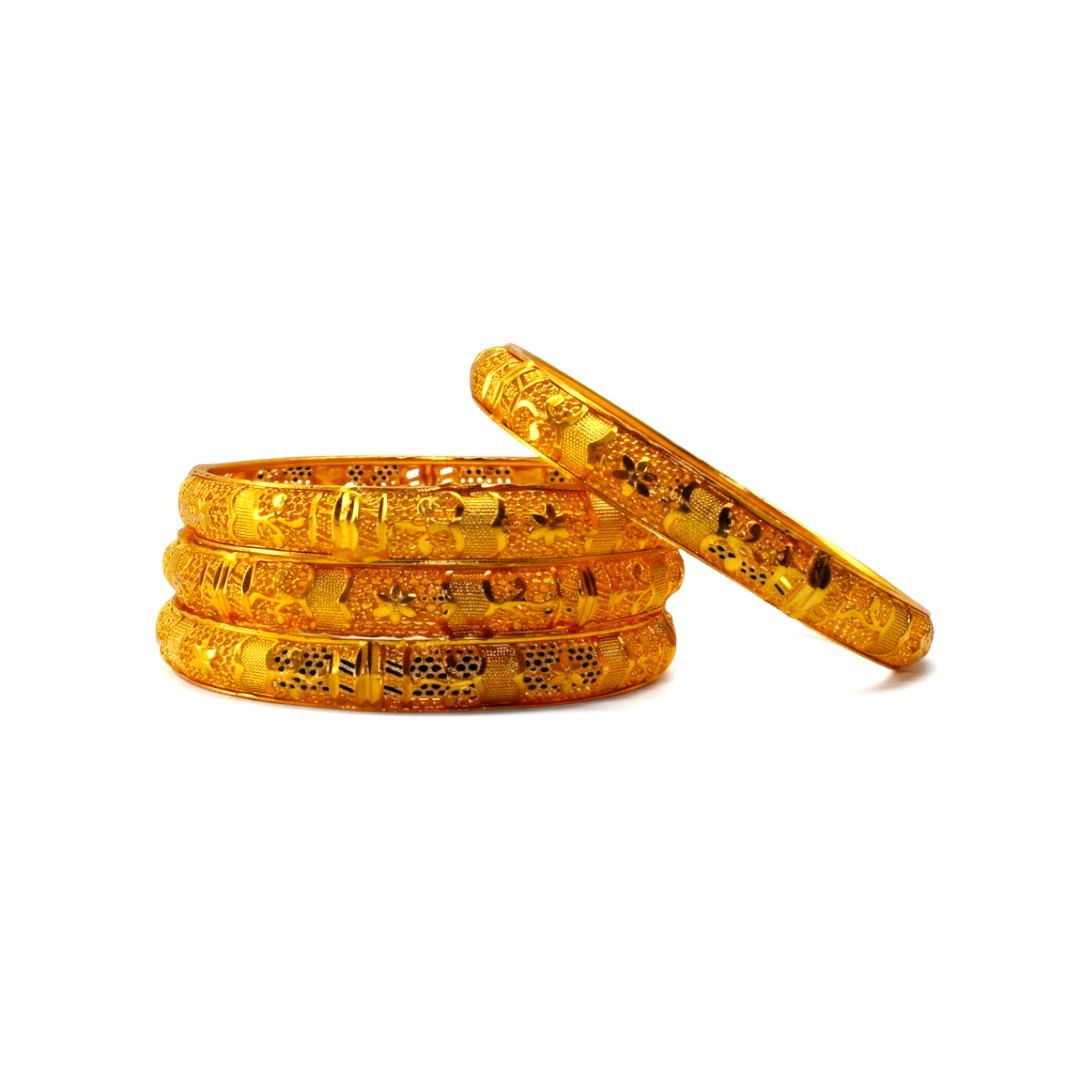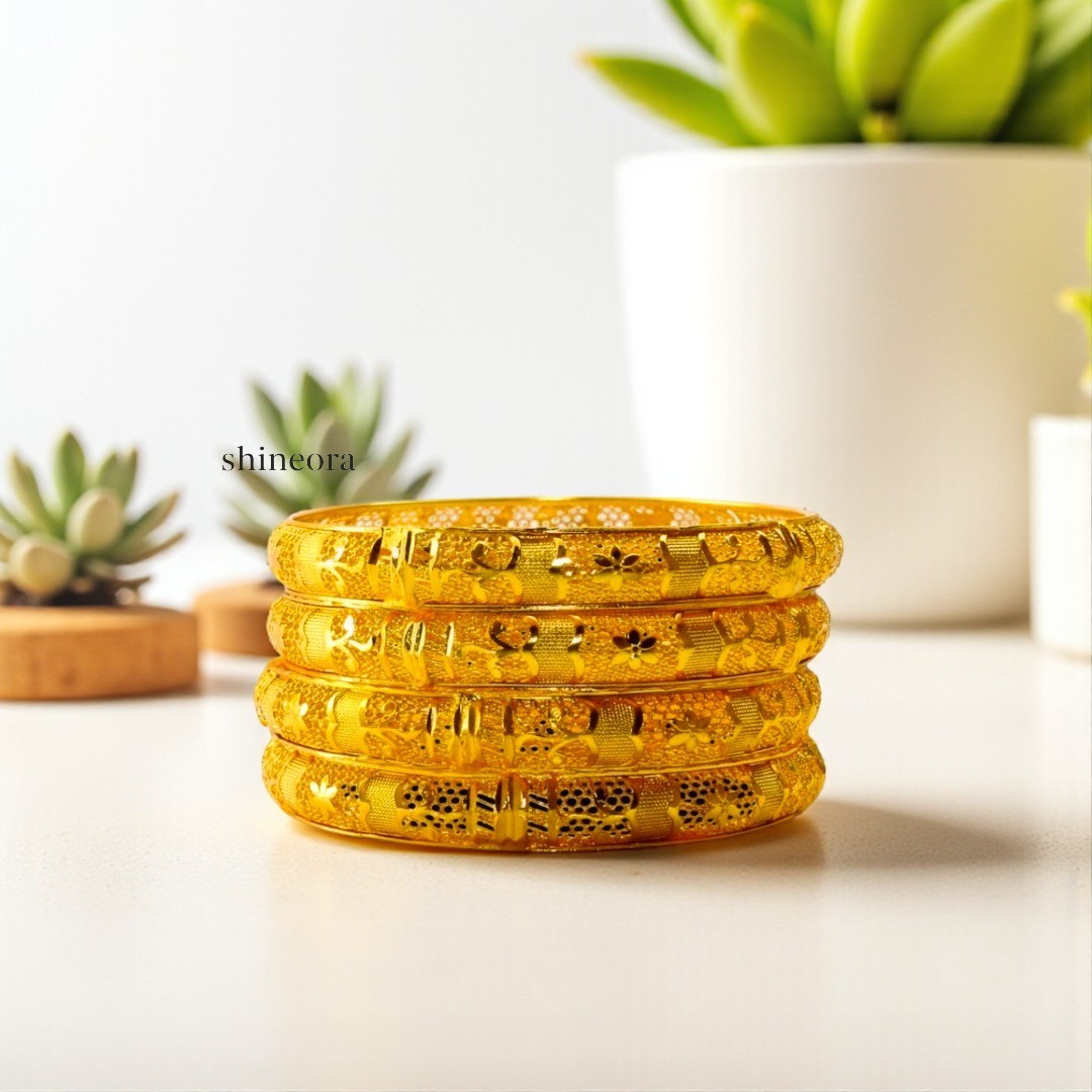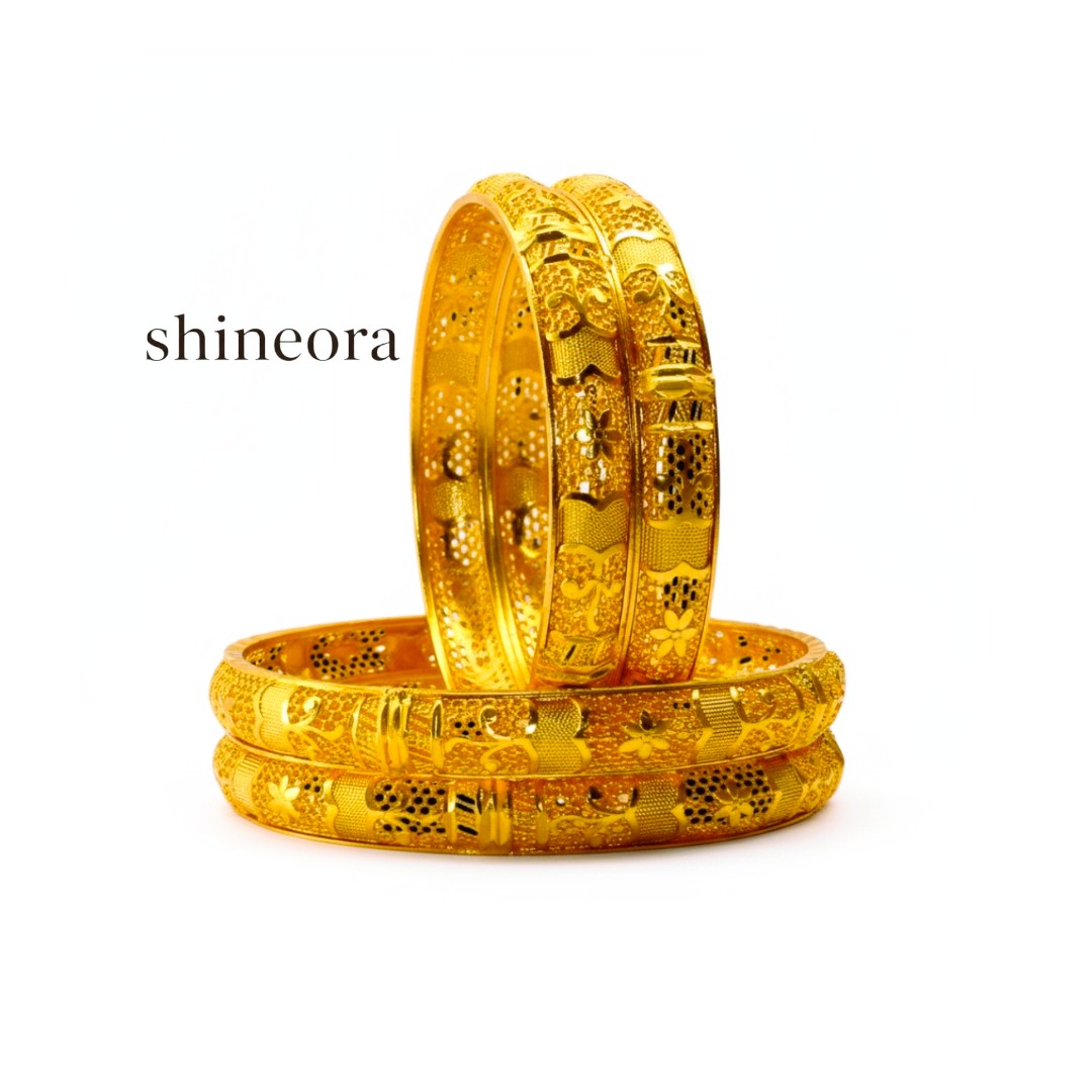 Elevate your traditional ensemble with this exquisite set of 22k gold-plated brass bangles from Shineora. These bangles showcase a stunning combination of intricate floral designs and sophisticated mesh patterns, crafted with meticulous attention to detail. The delicate lattice work and honeycomb-inspired perforations create a mesmerizing play of light, while the traditional motifs add a touch of timeless elegance. Perfect for special occasions, festivals, or wedding celebrations, these bangles feature a luxurious golden finish that adds glamour to any outfit. The sturdy brass construction ensures durability while maintaining a lightweight feel for comfortable all-day wear. The set includes multiple bangles that can be worn together for a grand look or individually for subtle sophistication. These versatile accessories beautifully complement both traditional Indian attire and contemporary fusion wear, making them a must-have addition to your jewelry collection. Each bangle in this set showcases superior craftsmanship with seamless finishing and secure closures.