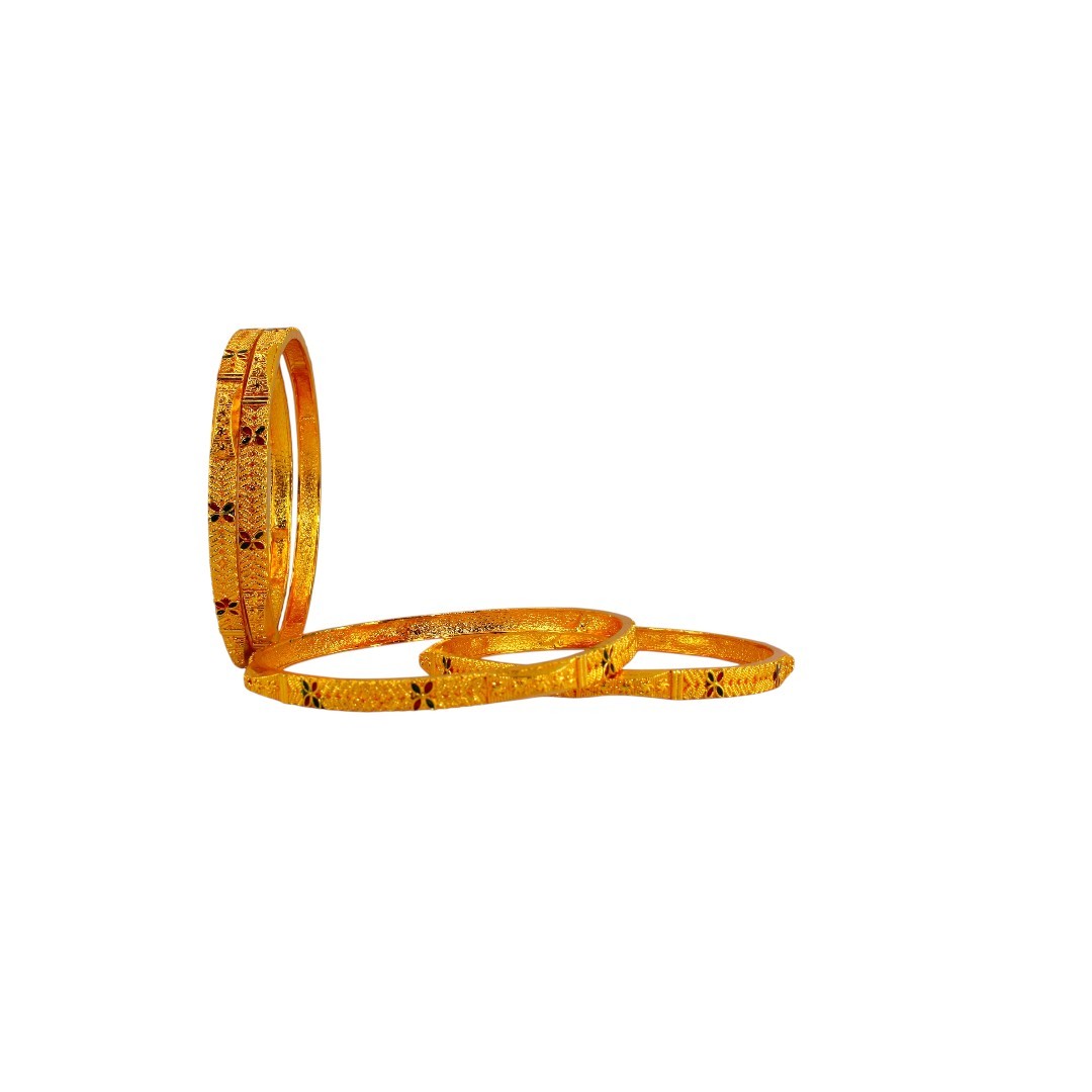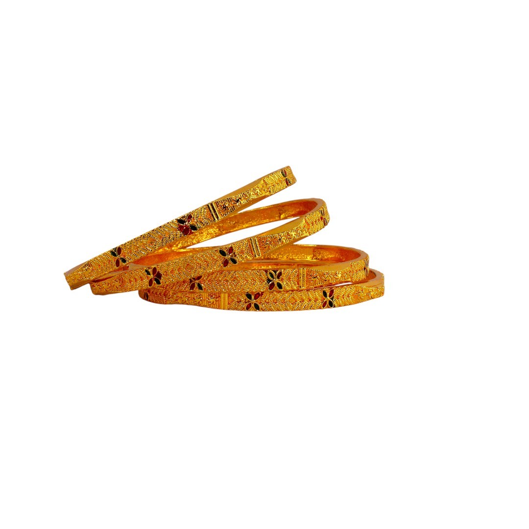 Elevate your traditional ensemble with this exquisite set of 4 gold-plated brass bangles from SHINEORA. Each bangle showcases a masterfully crafted traditional design featuring intricate geometric patterns and delicate floral enamel work. The bangles display a stunning combination of red and green enamel flowers set against a luxurious gold-plated background with detailed chevron texturing. Perfect for wedding ceremonies and festive occasions, these bangles bring together classical artistry with contemporary elegance. The substantial brass construction ensures durability while maintaining a lightweight feel for comfortable wear. The rich golden hue and meticulous craftsmanship make these bangles an ideal choice for both everyday wear and special occasions. These versatile accessories complement both traditional Indian attire and modern fusion wear, making them a valuable addition to your jewellery collection.