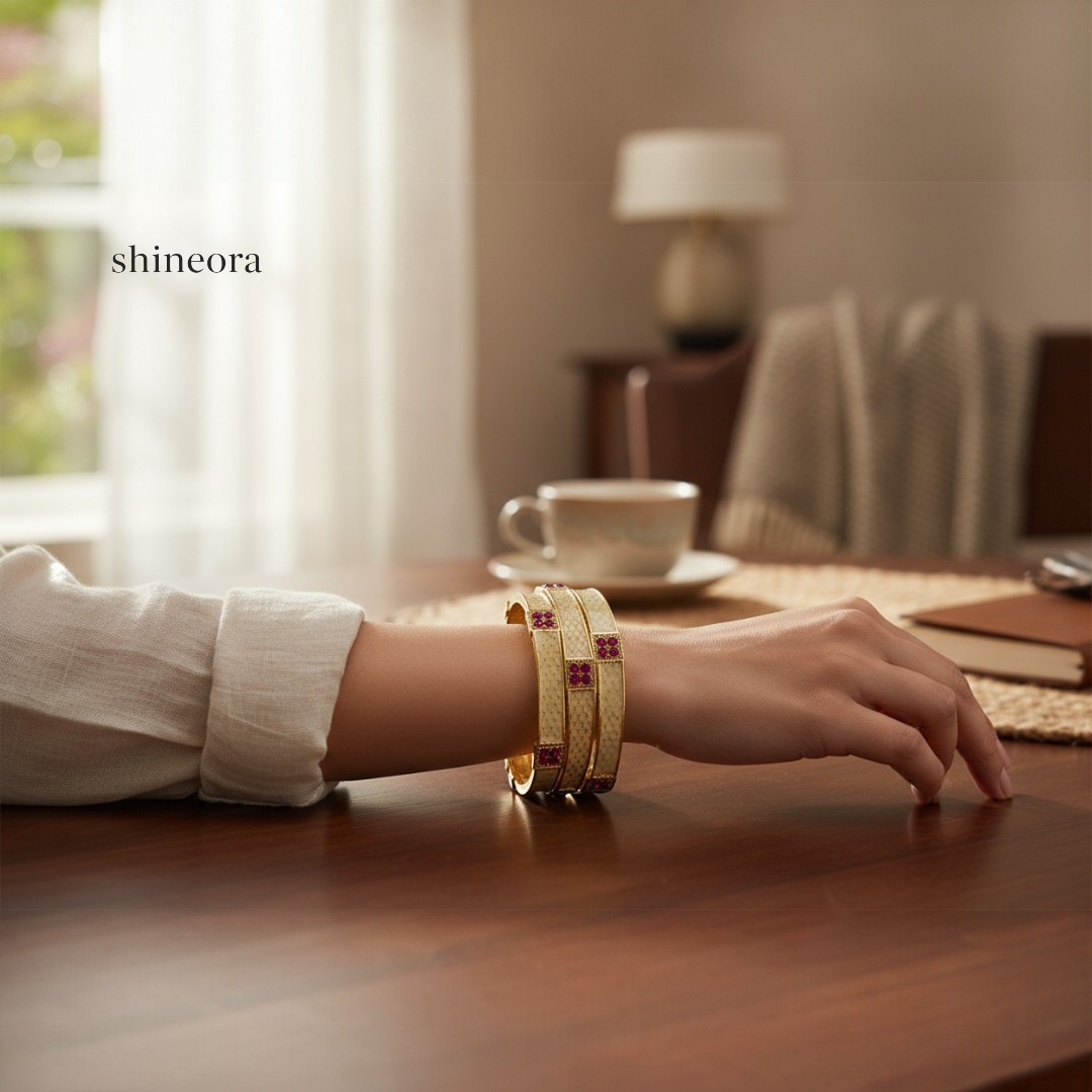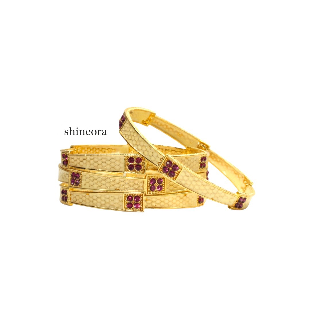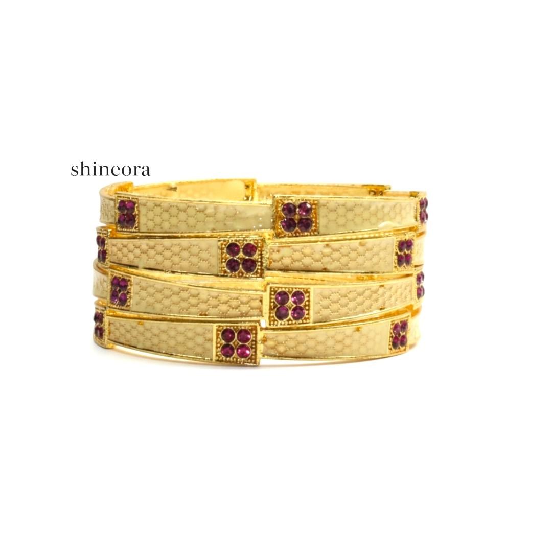 Elevate your traditional ensemble with this exquisite set of Shineora bangles that perfectly blend classic charm with contemporary style. These gold-plated bangles showcase a sophisticated textured pattern with delicate honeycomb-like detailing across their surface. Each bangle is beautifully adorned with deep purple stone embellishments arranged in elegant square clusters, adding a touch of royal glamour. The set features multiple bangles with matching designs, making them perfect for stacking or wearing individually. The cream-gold finish complements the rich purple stones, creating a luxurious contrast that catches the light beautifully. These bangles are ideal for special occasions, festivals, or traditional ceremonies, and can be paired with both Indian ethnic wear and modern outfits. The hinged design ensures comfortable wear and secure closure, while the detailed craftsmanship speaks of premium quality. These versatile accessories will add a touch of sophistication to any outfit, making them a must-have addition to your jewelry collection.
