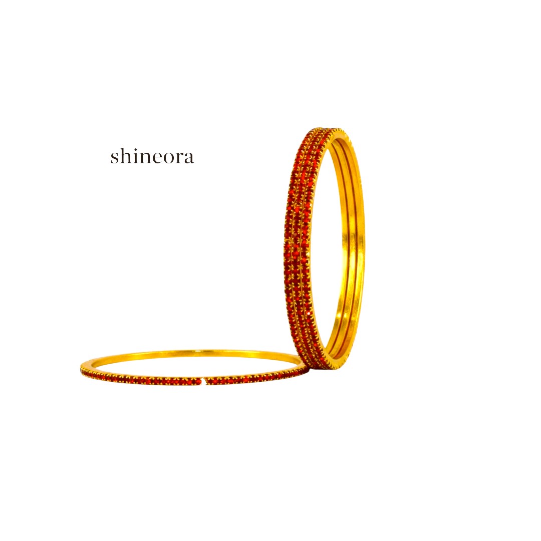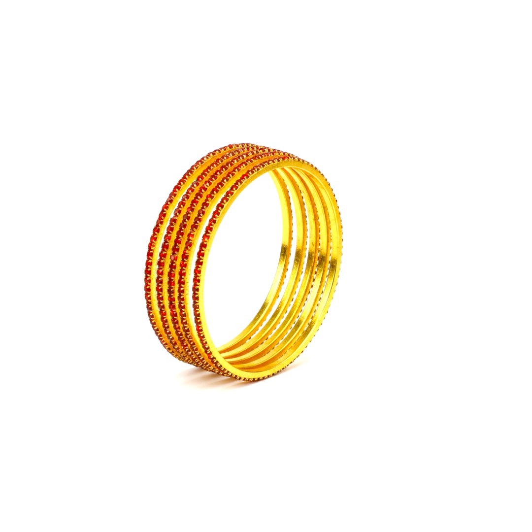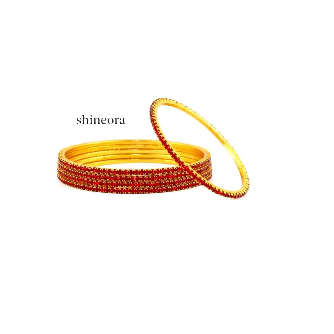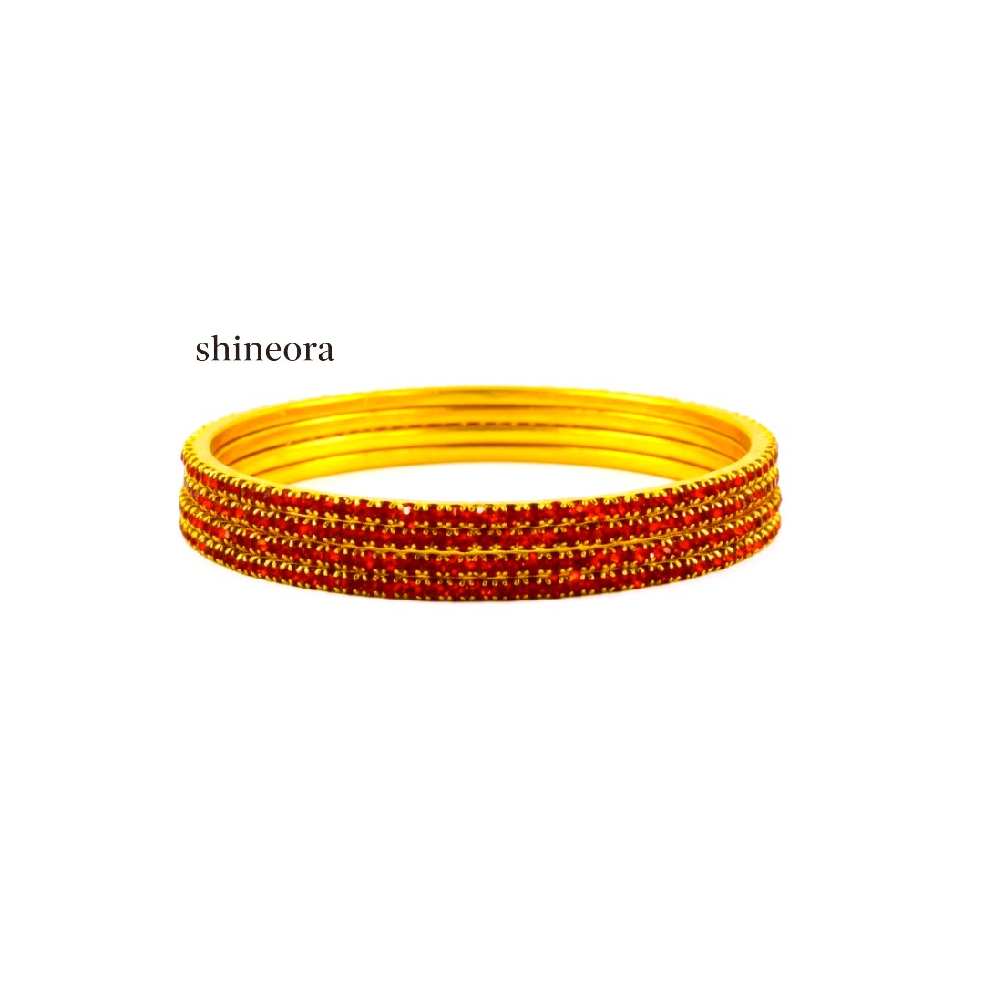 Add a touch of traditional elegance to your ethnic ensemble with this stunning set of 4 gold-toned bangles from SHINEORA. These exquisite bangles feature intricate red stone work that catches the light beautifully, creating a mesmerizing sparkle with every movement. The classic design combines the timeless appeal of traditional Indian jewellery with contemporary styling, making them perfect for both festive occasions and special events. Each bangle in this set is crafted with precision, showcasing a delicate pattern of red stones arranged in continuous rows against the lustrous gold-toned base. The bangles are sized to fit most wrists comfortably and can be coordinated with various Indian outfits, from sarees to lehengas. This versatile set makes for a stunning addition to your jewelry collection and can be paired with other traditional accessories for a complete look. The lightweight construction ensures comfortable wear throughout long celebrations and events.