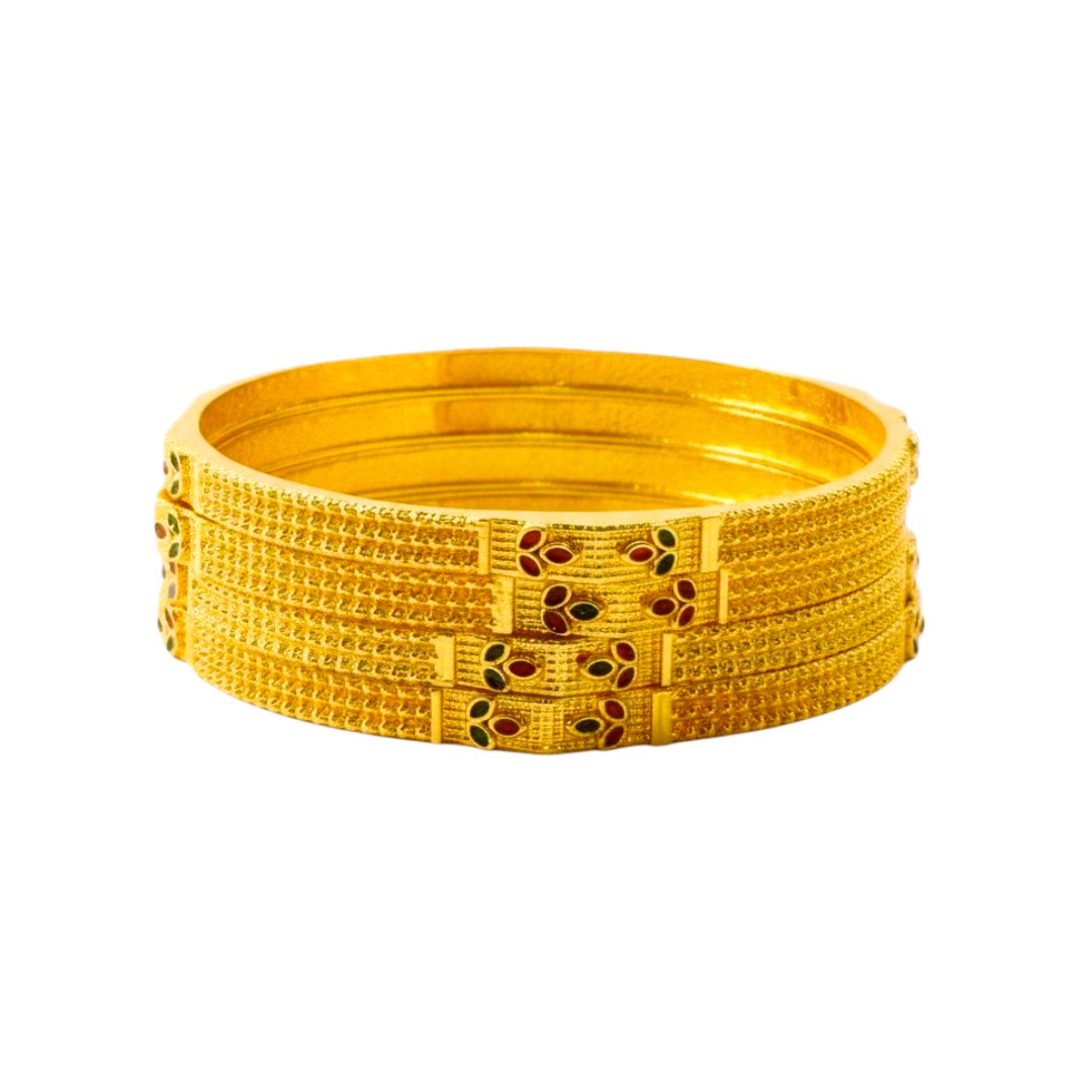 Elevate your traditional ensemble with this exquisite set of 4 gold-plated bangles from Shineora. These beautifully crafted bangles showcase intricate traditional Bengali design patterns with stunning red and green enamel work that adds a royal touch to the ornate metalwork. Each bangle features a sophisticated combination of detailed filigree patterns and geometric designs, complemented by elegant floral motifs in contrasting enamel colours. The set’s classic width and comfortable fit make it perfect for both everyday wear and special occasions like weddings, festivals, or formal gatherings. The bangles’ premium gold plating offers a luxurious shine while maintaining durability. This versatile set can be worn together for a bold statement or individually for a subtle accent to your attire. The timeless design makes these bangles an excellent addition to your jewellery collection or a thoughtful gift for someone special. These bangles embody the rich heritage of Bengali craftsmanship while maintaining contemporary appeal.