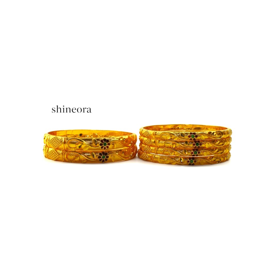Elevate your traditional ensemble with this exquisite set of 6 gold-plated bangles from SHINEORA. Each bangle showcases an intricate floral design pattern embellished with stunning red and green enamel work, creating a perfect blend of classic and contemporary aesthetics. The bangles feature a detailed mesh pattern and textured finish that adds depth and sophistication to the design. These beautifully crafted accessories are perfect for festive occasions, weddings, or any traditional celebration. The substantial look and feel of these bangles make them appear like authentic jewelry pieces, while the gold plating provides a luxurious shine that catches the light beautifully. The set’s versatile design complements both traditional Indian attire and modern fusion wear. These bangles can be worn as a complete set for a bold statement or individually for a subtle accent to your outfit. The combination of red and green enamel work adds a pop of colour that brings these traditional bangles to life, making them a must-have addition to your jewelry collection.