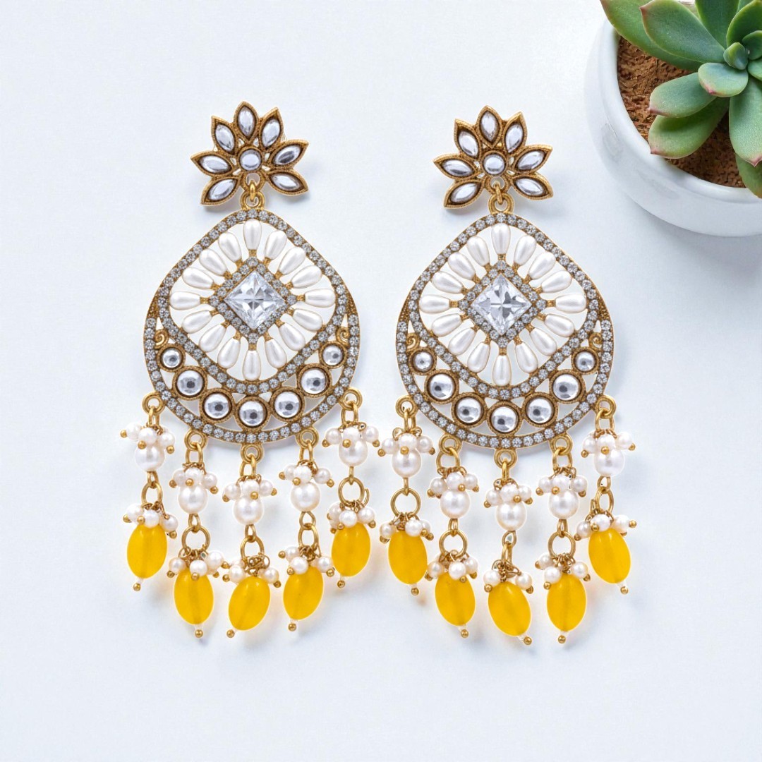 Brighten your festive look with the Golden Radiance Chandbali Earrings, a masterpiece that captures the warmth of gold and the elegance of pearls. Crafted in a premium 1-gram gold finish, these exquisite earrings feature intricate Kundan-style detailing, sparkling white stones, and a stunning combination of pearls and golden-yellow drops — symbolizing light, prosperity, and celebration.