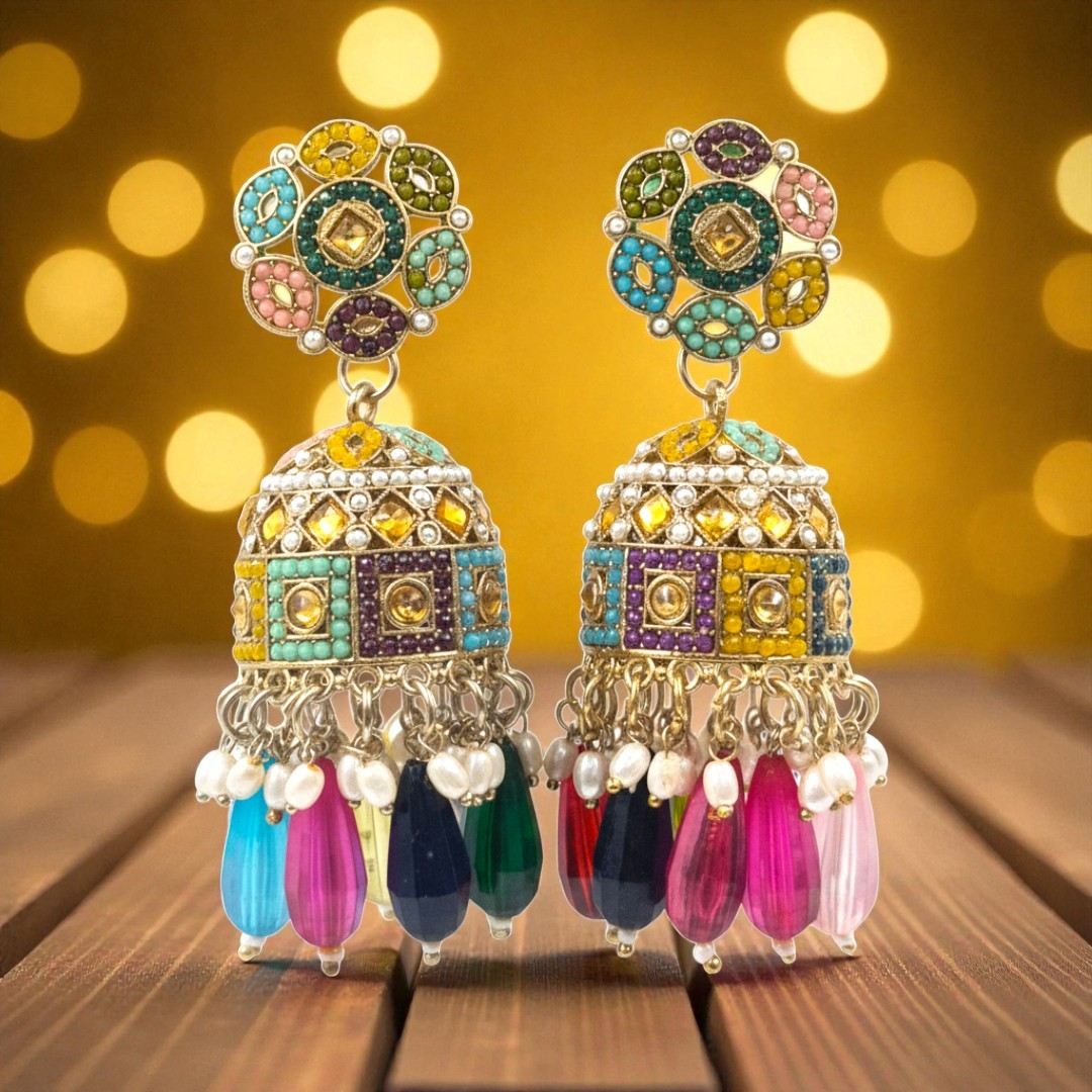 Step into the spotlight with Noor-E-Rang Jhumka, a stunning pair of handcrafted earrings that capture the essence of festive elegance. Designed by Shineora Jewels, these multicolor jhumkas are a vibrant fusion of traditional artistry and modern glam.
