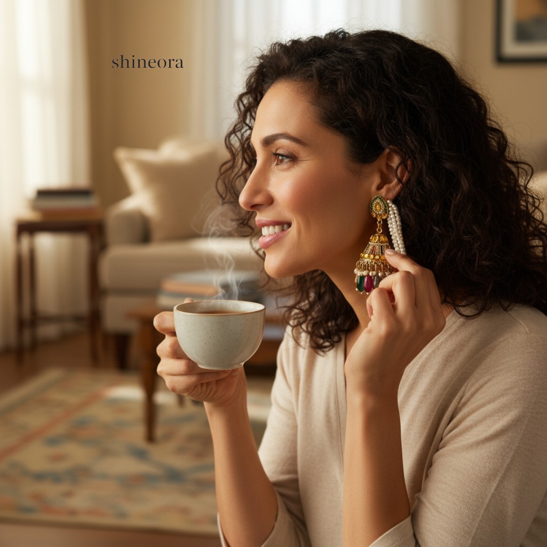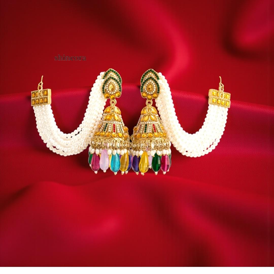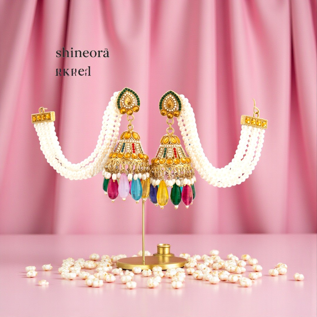 Step into timeless grandeur with our Royal Spectrum Pearl Jhumka, a stunning masterpiece that celebrates traditional artistry with a modern twist. Crafted in luxurious gold plating, these statement jhumkas feature intricate detailing, vibrant multi-colored beads, and cascading pearl strands that gracefully enhance your festive and bridal look.