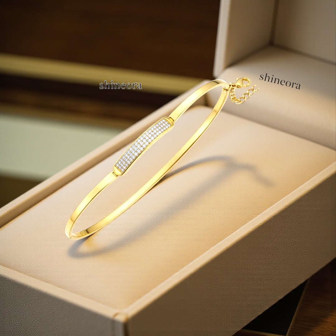 Sophisticated simplicity at its finest — the Shineora Elina Luxe Bangle is designed for the modern woman who values timeless elegance. Crafted in radiant one-gram gold plating, this sleek bangle features a gracefully polished finish adorned with a panel of fine crystal detailing that sparkles with every move. Lightweight, skin-friendly, and effortlessly chic, it transitions seamlessly from daily wear to evening elegance. A perfect blend of minimalism and luxury — this bangle embodies Shineora’s signature craftsmanship and refined taste.