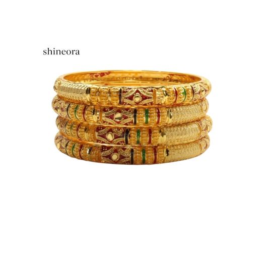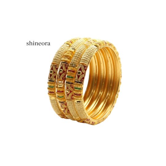 Traditional gold-plated bangles adorned with intricate patterns and multicolored enamel work in red, green, and black accents