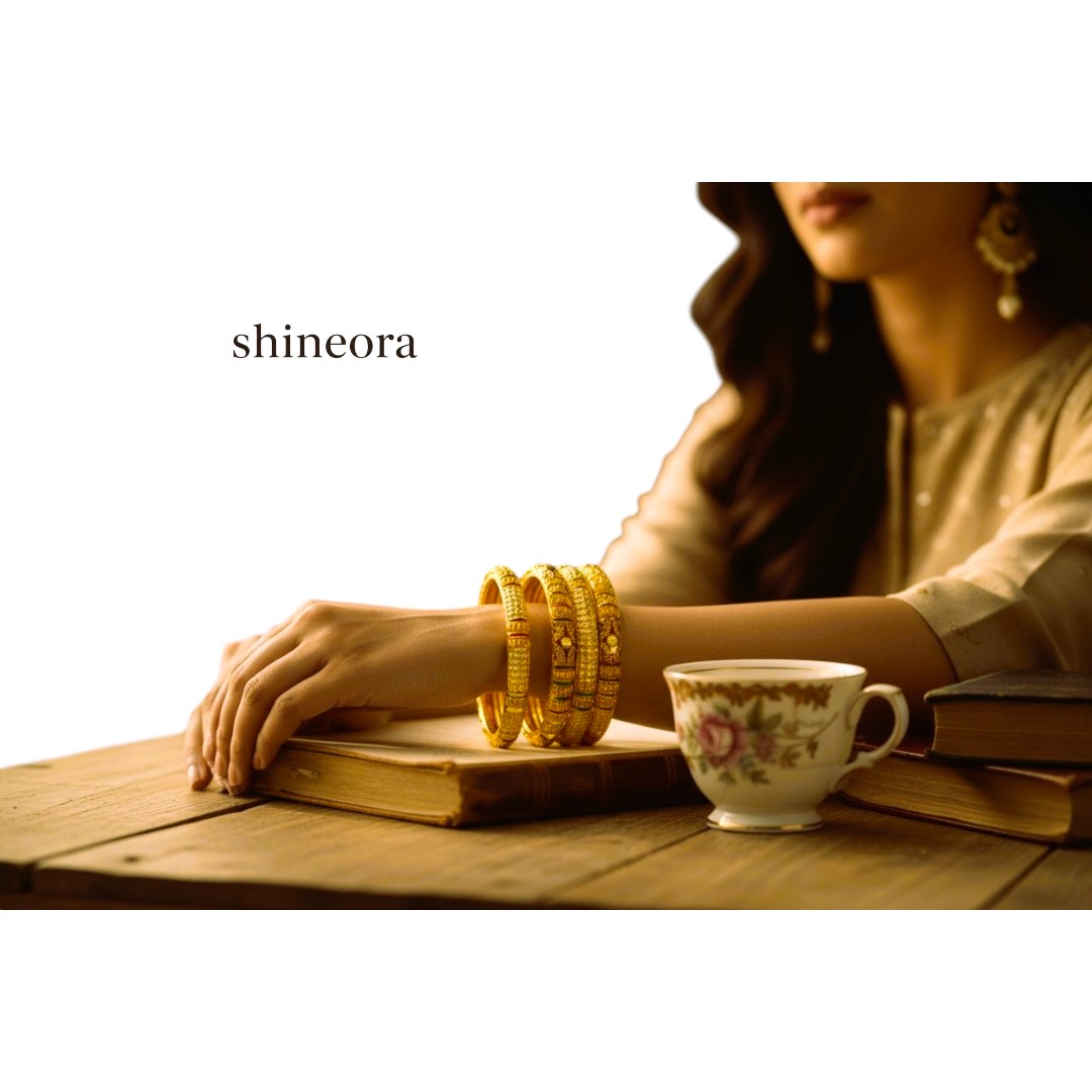 Add a touch of traditional elegance to your ethnic ensemble with this exquisite set of 4 gold-plated bangles from SHINEORA. Each bangle features an intricate design adorned with multicoloured enamel work, showcasing a perfect blend of red, green, and black accents against the lustrous golden base. The bangles boast a detailed geometric pattern with delicate craftsmanship, making them ideal for festive occasions, weddings, or any traditional celebration. The set’s classic design incorporates textured detailing and meticulous metalwork that catches light beautifully. These bangles are versatile enough to complement both traditional Indian attire and contemporary fusion wear. The substantial yet comfortable design ensures these bangles sit gracefully on your wrist while making a striking style statement. Perfect for gifting or adding to your personal collection, these bangles represent the pinnacle of Indian jewellery craftsmanship.