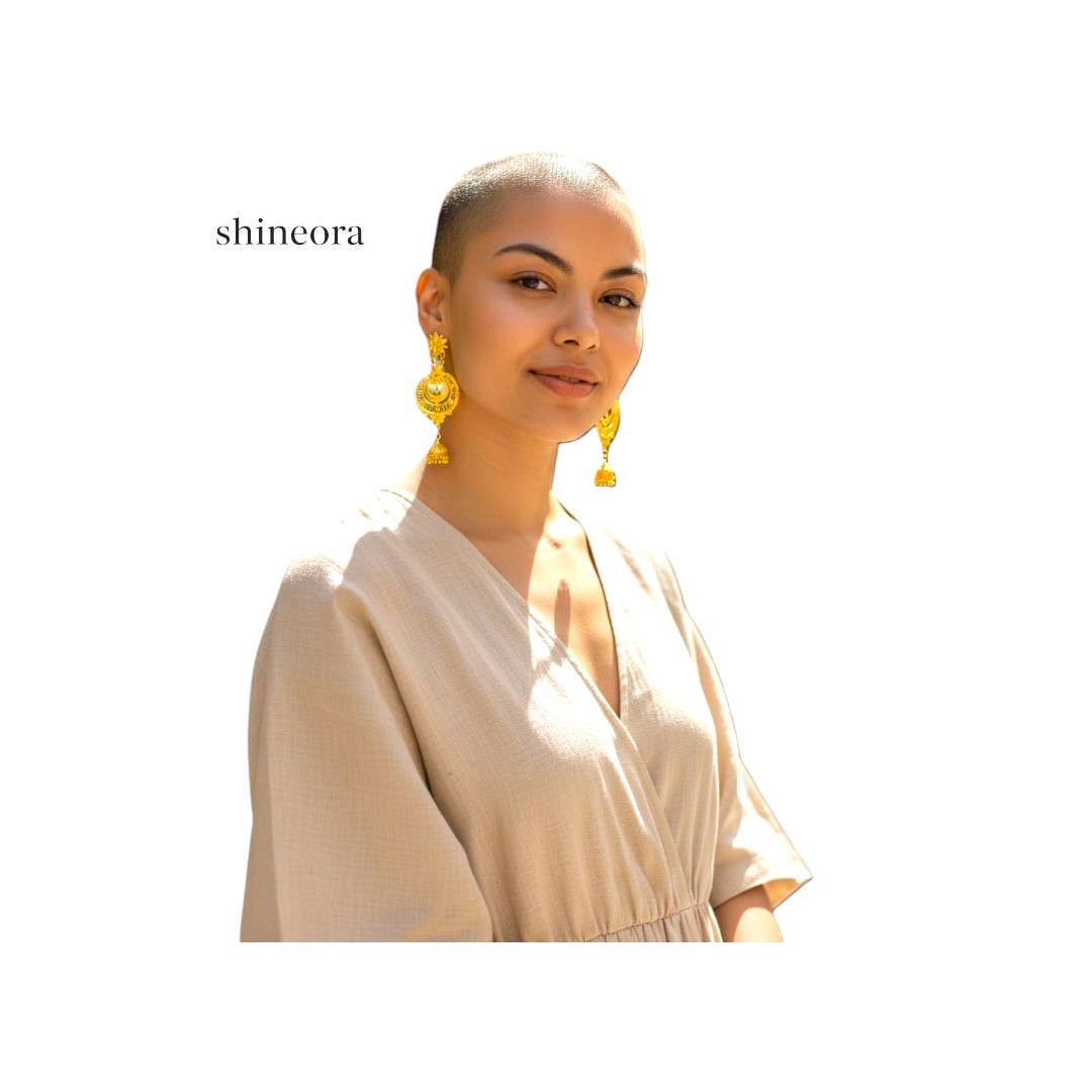 The delicate jhumki drop at the bottom adds a graceful sway, making it the perfect accessory for festive occasions, weddings, or cultural events. Hand-polished to perfection, this design captures the warmth of gold and the charm of traditional craftsmanship, blending effortlessly with sarees, lehengas, and ethnic ensembles.