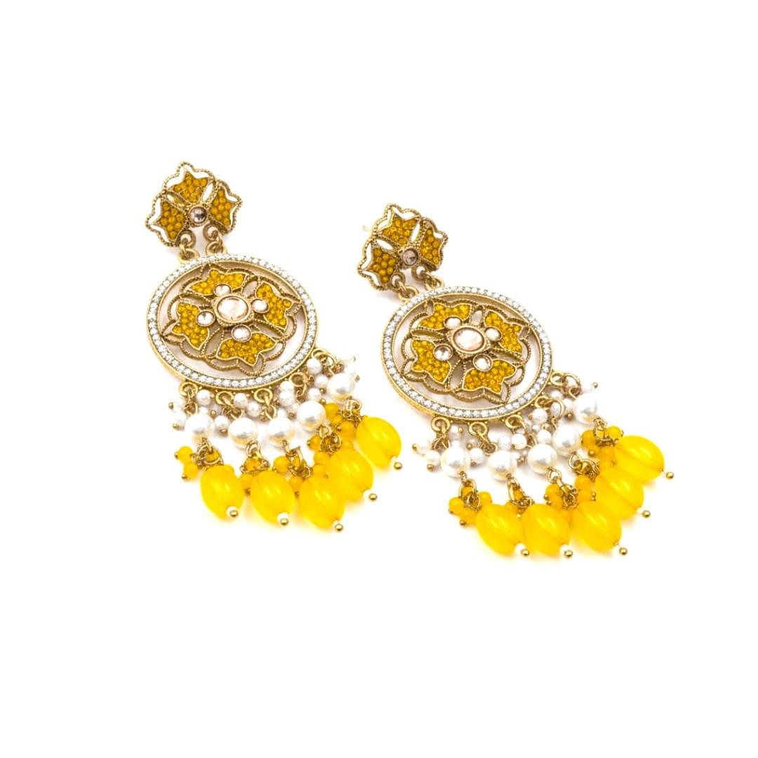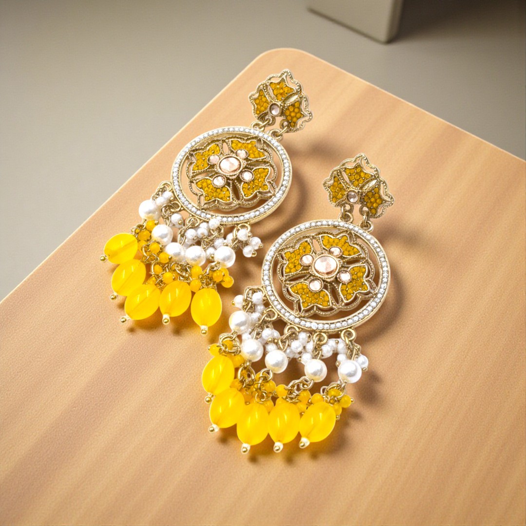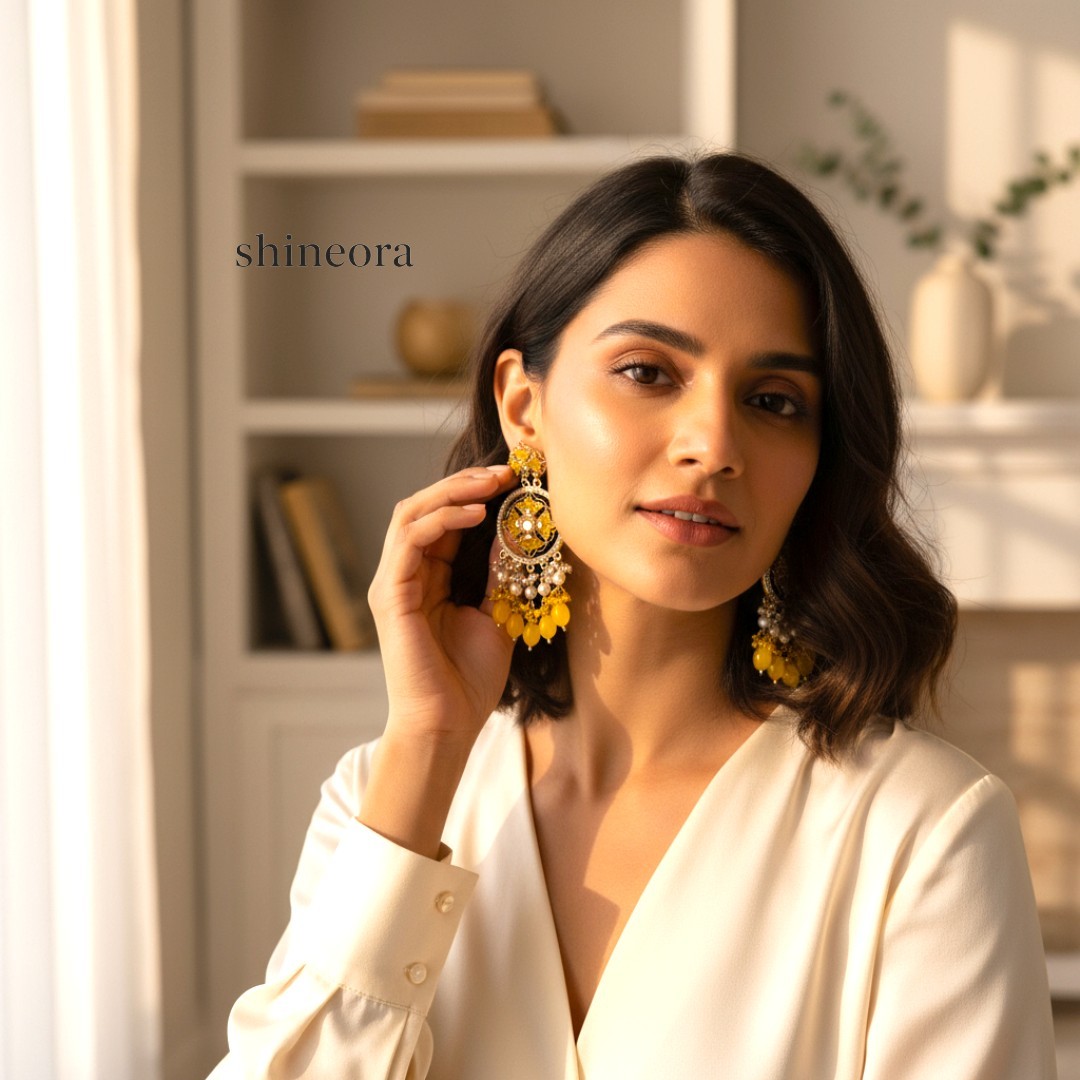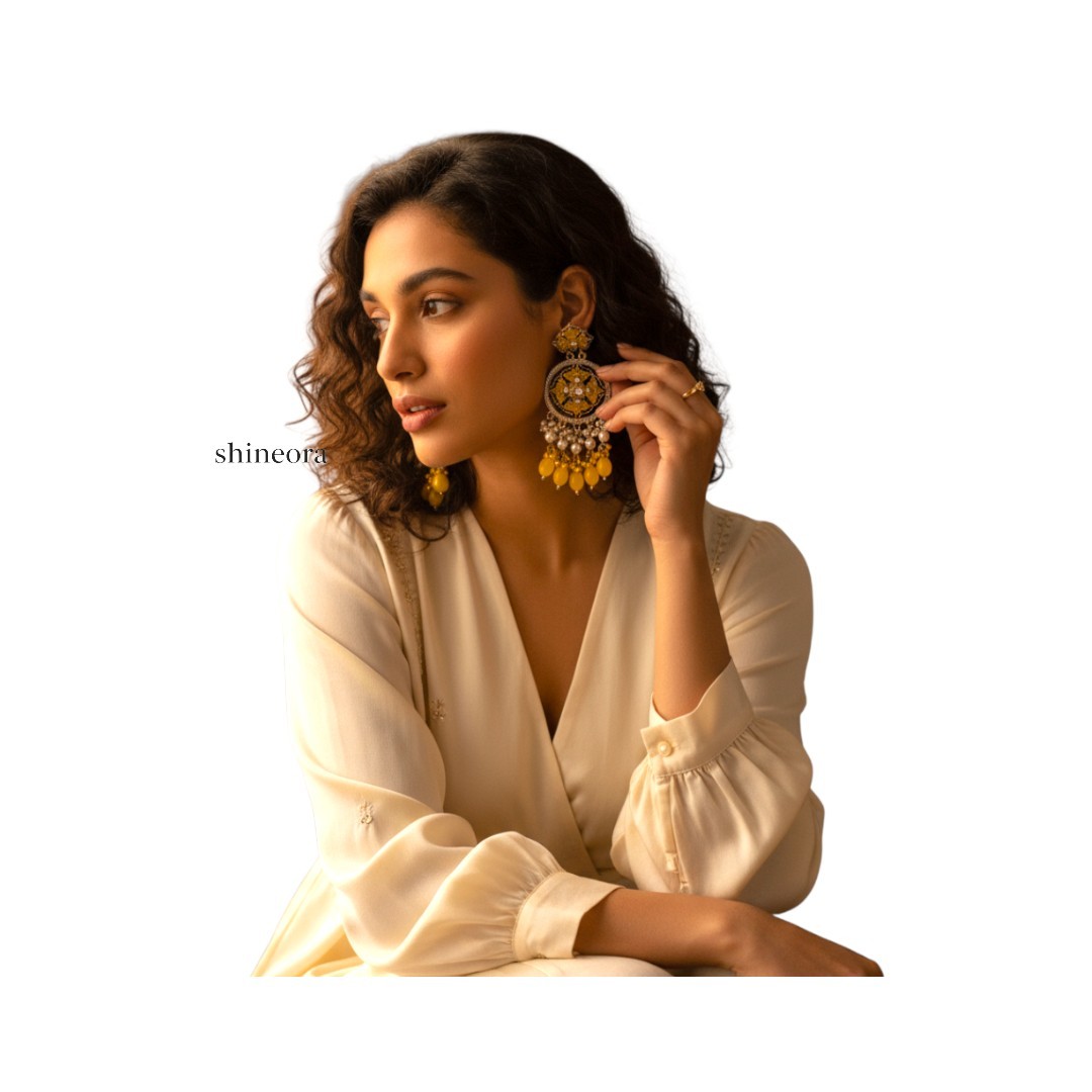 Brighten your look with the Sunshine Glow Chandbali Earrings, a radiant blend of tradition and contemporary charm. These gold-plated earrings feature intricate enamel work in a rich mustard-yellow tone, complemented by shimmering pearls and matching yellow drops. Designed to capture attention, they exude warmth and joy — making them ideal for festive celebrations, haldi ceremonies, or elegant daytime events.